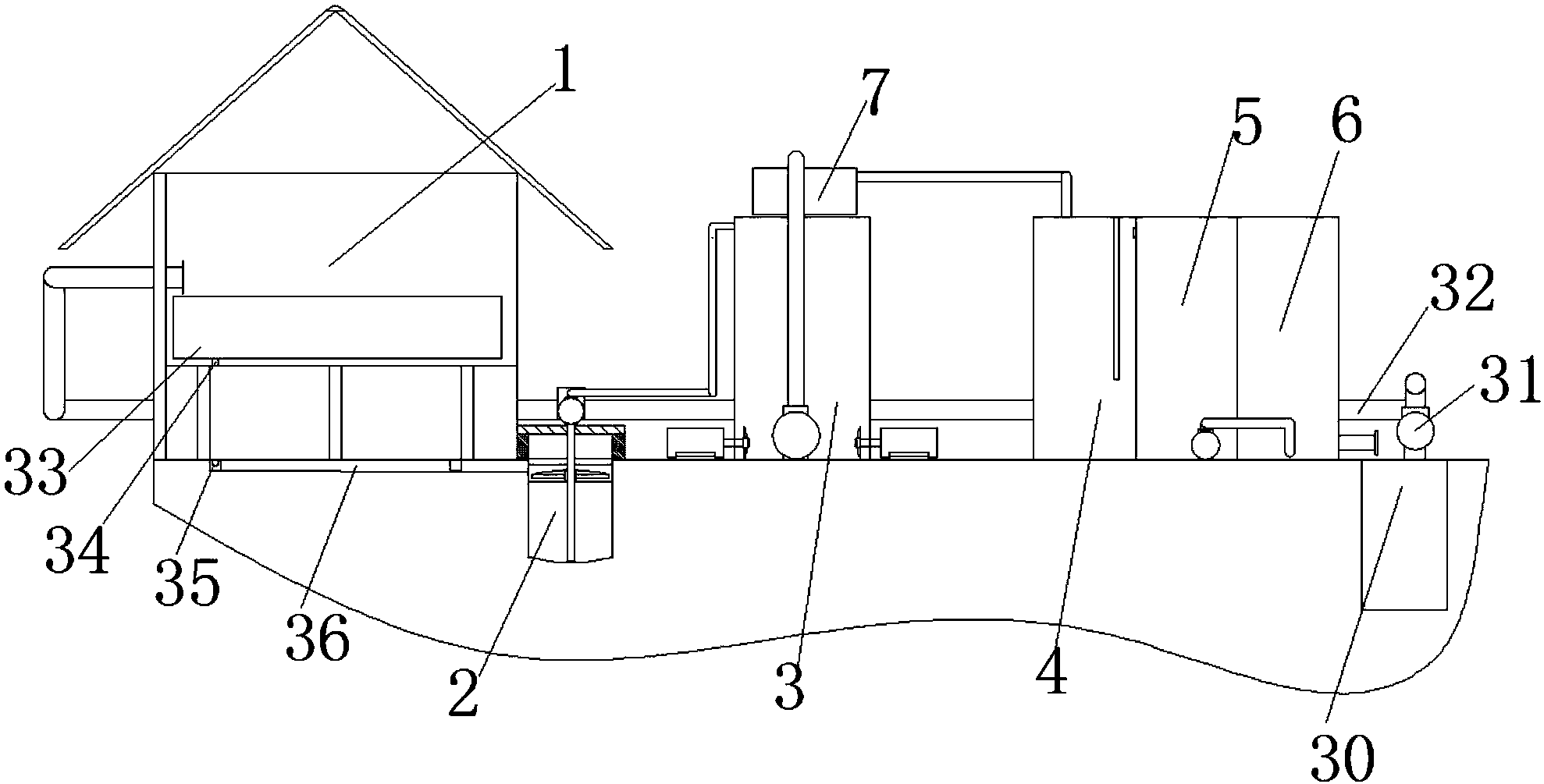 1、本發明通過依次設置有污水收集池、預處理箱、固液分離器、兼氧箱、曝氣箱、生物膜過濾器和水井,通過生物膜過濾器牌排放的廢水進入水井后被消毒,然后被抽入養殖舍內清洗水箱,清洗水箱通過清洗管和清洗支管對養殖舍內的地面和排污槽進行清洗,清洗的污水循環處理,使水資源進行循環使用,裝置運行穩定性較好,降低了運行成本;
