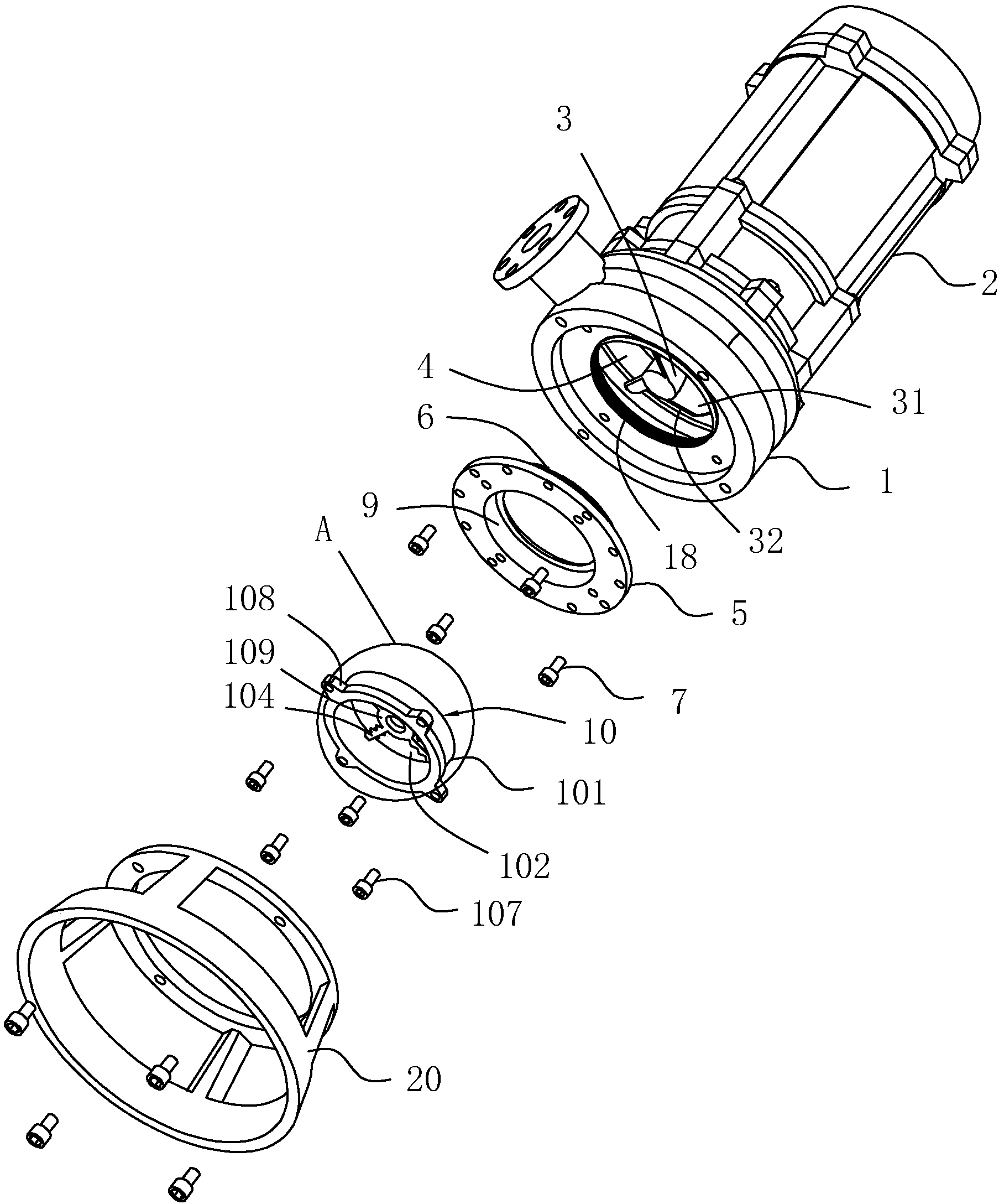 3.根據權利要求2所述的一種切割污水污物潛水電泵,其特征是:所述切割刀盤(101)上設有翻邊(108),所述翻邊(108)抵靠且突出于安裝盤(5)背離葉輪(3)的側壁上,所述鎖緊螺栓(107)連接于翻邊(108)上。