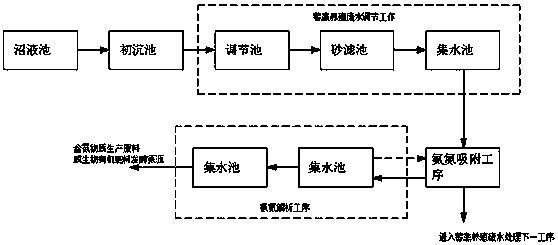 綜上所述,本方法中的步驟c)、步驟d)和步驟e)中的交換劑和氨氮解析液能充分的對(duì)畜禽養(yǎng)殖廢水中的大部分的氨氮進(jìn)行回收,同時(shí)交換劑和氨氮解析液中回收的氨氮可以根據(jù)需要制成產(chǎn)品,如氯化銨、硫酸銨等,也可作為農(nóng)業(yè)秸稈發(fā)酵的氮源,且將畜禽養(yǎng)殖廢水中的大部分的氨氮回收后,畜禽養(yǎng)殖廢水內(nèi)的C/N的比例提高便于后期對(duì)畜禽養(yǎng)殖廢水進(jìn)行生化處理,能有效的降低畜禽養(yǎng)殖廢水處理的成本。