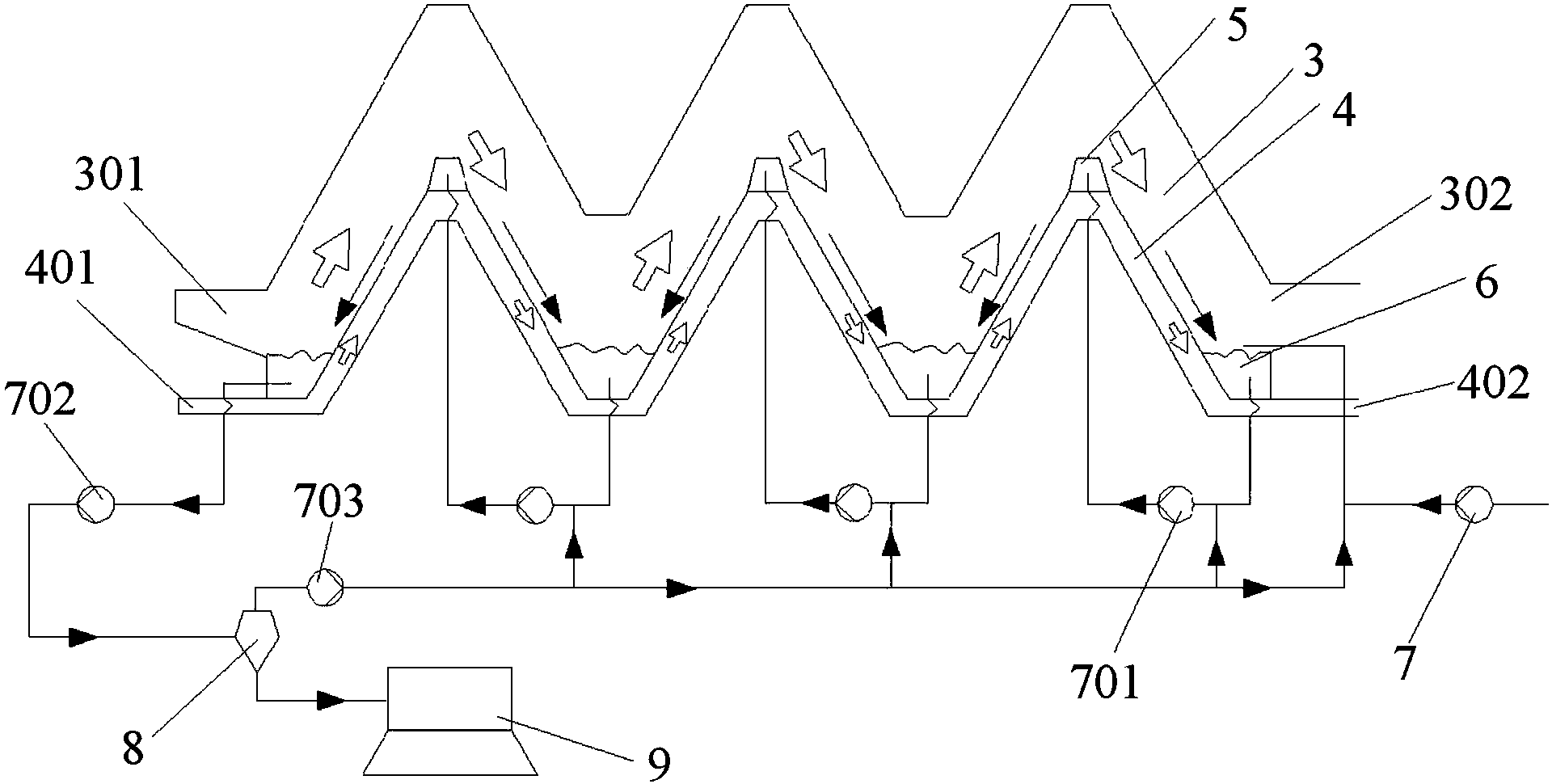 沿煙氣反方向,相鄰的集液槽(6)與分液槽(5)之間設置有輸送泵(701);所述輸送泵(701)的進液口通過輸送管道與所述集液槽(6)連接,所述輸送泵(701)的出液口通過輸送管道與所述分液槽(5)連接;所述輸送泵(701)的廢水輸送方向與煙氣流向相反;