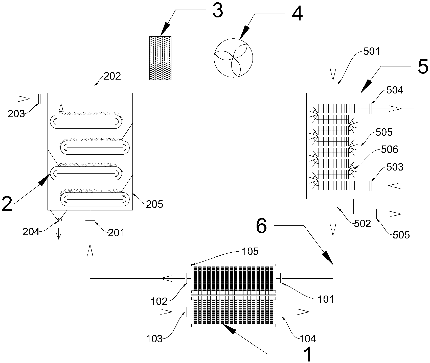 優(yōu)選的,作為一種可實施方案;所述除塵過濾器的出口與所述風(fēng)機的進口通過一段連接管道連通,所述風(fēng)機的出口與所述冷凝器的冷凝器熱風(fēng)進口之間通過一段連接管道連通,且所述冷凝器的冷風(fēng)出口與所述空氣換熱器的冷風(fēng)進口通過一段連接管道連通。