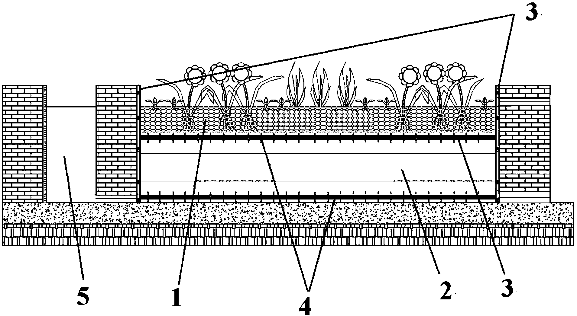 運行費用:運行過程中,本發明增加了反沖洗的動力費用,但因反沖洗的次數少(每季度一次),其運行費用增加量約為現有人工濕地的5%;本發明可無限期延長人工濕地的運行期,至少因解決了介質堵塞問題使系統維修費降為傳統人工濕地維修費的1/10。維修費用按占運行費用的40%計,則可節約運行費用36%左右。因此,本發明可節約運行費用31%。