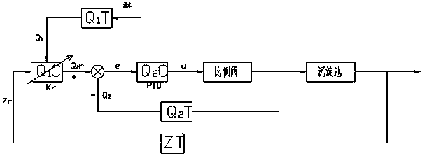 一個實時監測進入沉淀池的污水流量值的流量傳感器Q1T;一個實時監測進入沉淀池的凝聚劑流量值的流量傳感器Q2T;一個實時監測沉淀池內污水濁度的濁度計ZT;一個計算污水與凝聚劑的實時質量比例參數K實的比例控制器Q1C,所述質量比例參數K實是一個變量;一個控制凝聚劑流量大小的比例閥V;以及,一個調節比例閥V的PID控制器Q2C;