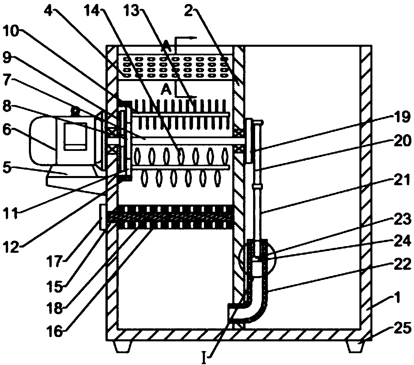2.根據權利要求1所述的一種用于環保的生活污水凈化再利用裝置,其特征在于,所述集水箱(1)下方左右對稱固定連接彈性支撐墊(25),彈性支撐墊(25)為橡膠材質支撐,所述彈性支撐墊(25)通過螺栓與集水箱(1)固定連接。