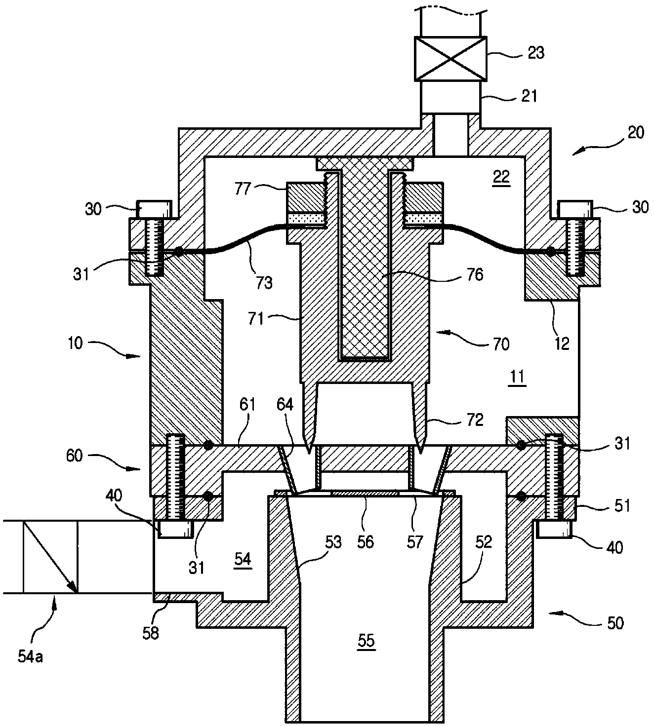 進一步地,隔膜的外邊緣可以固定至上蓋和主體之間的耦接部分,并且隔膜的內邊緣可以通過固有螺母緊固至舉升主體的舉升主體頭部。