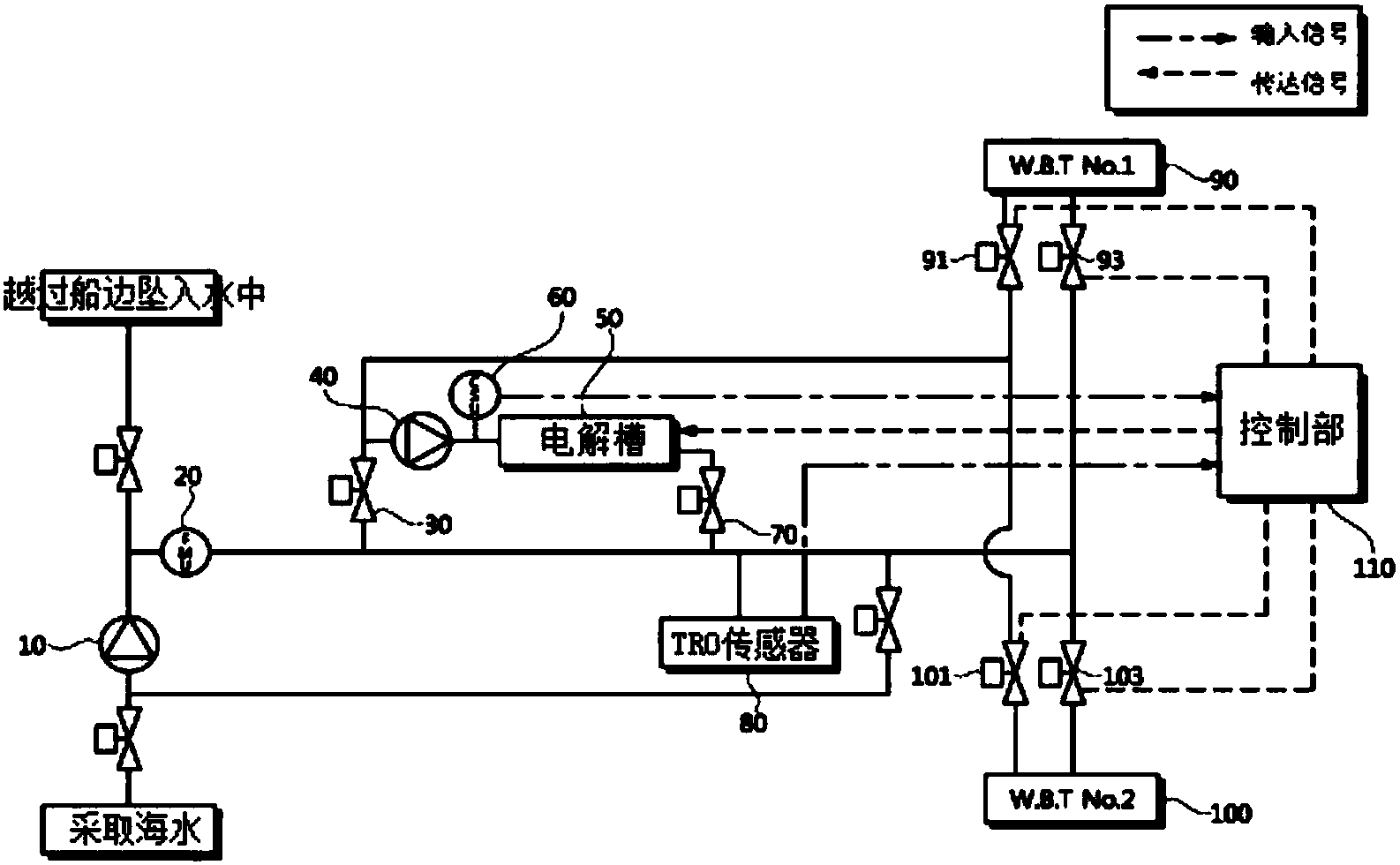 根據(jù)為了達(dá)成上述目的而提出的本發(fā)明第一觀點(diǎn)的電解方式的船舶壓艙水處理裝置包括:多個壓載艙,流入壓艙水;壓艙水主流(main stream),向所述壓載艙供應(yīng);壓艙水側(cè)流(side stream),在所述壓艙水主流中分支;電解槽,用于電解所述壓艙水側(cè)流;第一鹽度測量工具,測量流入所述電解槽的壓艙水側(cè)流的鹽度;第二鹽度測量工具,測量至少流入所述壓載艙中的一個的壓艙水的鹽度;控制器,在由所述第一鹽度測量工具測量的鹽度小于臨界值的情況下,以所述第二鹽度測量工具測量出的鹽度值為根據(jù),從所述多個壓載艙中的一個向所述電解槽供應(yīng)壓艙水。