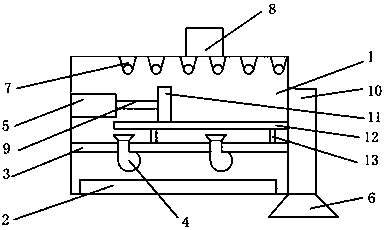 1.一種污泥殺菌裝置,包括殺菌裝置本體(1),其特征在于:所述殺菌裝置本體(1)的底部設有高溫加熱裝置(2),所述高溫加熱裝置(2)上方設有支撐板(3),所述支撐板(3)上均勻設有鼓風機(4),所述支撐板(3)上方設有物料放置板(12),所述物料放置板(12)通過支撐桿(13)連接在支撐板(3)上,所述物料放置板(12)上方設有物料推板(11),所述物料推板(11)的左側設有液壓缸(5),且液壓缸(5)通過活塞桿(9)連接物料推板(11),所述殺菌裝置本體(1)的頂部設有紫外線殺菌燈(7),所述殺菌裝置本體(1)上方設有物料進口(8),所述殺菌裝置本體(1)的右側設有集泥箱(10),所述集泥箱(10)的下方設有物料出口(6)。