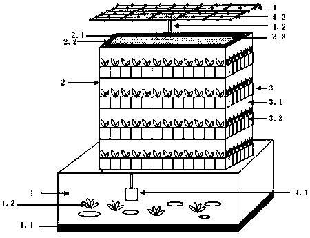 3.如權利要求1所述的垂直污水凈化與植物栽培系統,其特征是所述生物濾墻,是在不銹鋼鋼網包圍起來的框架結構內部空間中,層層充填生物濾料后形成類似墻體的構造件;生物濾料選用石英砂、無煙煤、陶粒、麥飯石、珊瑚石、火山石、活性炭的一種或多種多孔、硬質材料,將生物濾料進行分層或混合,自下向上將生物濾墻內空間充填滿。