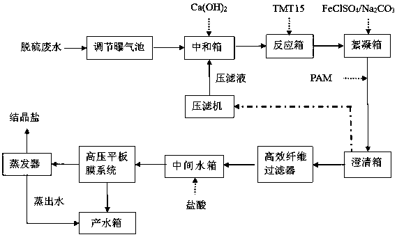 1. 一種脫硫廢水零排放處理工藝,其特征在于,包括依次相連的調(diào)節(jié)曝氣池、中和箱、反應(yīng)箱、絮凝箱、澄清箱、高效纖維過濾器、中間水箱、高壓平板膜系統(tǒng)和蒸發(fā)器,處理步驟如下: