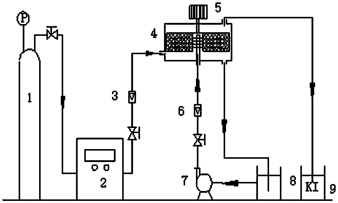 催化臭氧化處理酸性硝基苯廢水的方法,以旋轉填料床為氣體吸收和反應裝置,將溶有Mn2+和H2O2的酸性硝基苯廢水、含有臭氧的氣體同時通入旋轉填料床,硝基苯模擬廢水在泵入旋轉填料床前將pH調為1~5。