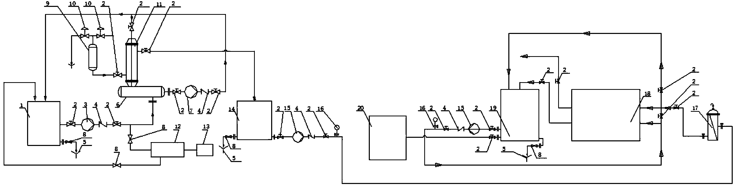 1.一種生產(chǎn)氧化鋁產(chǎn)生的高含鹽廢水零排放處理裝置,包括過(guò)濾前高含鹽水水箱(1)、蝶閥(2)、原料泵(3)、止回閥(4)、排水溝(5)、集液箱(6)、循環(huán)泵(7)、球閥(8)、集氣瓶(9)、氣動(dòng)蝶閥(10)、陶瓷膜組件(11)、板框壓濾機(jī)(12)、污泥場(chǎng)(13)、過(guò)濾后高含鹽水水箱(14)、增壓泵(15)、壓力表(16)、保安過(guò)濾器(17)、低壓電化學(xué)裝置(18)、循環(huán)水箱(19)和蒸發(fā)結(jié)晶裝置(20),其特征在于,所述過(guò)濾前高含鹽水水箱(1)通過(guò)導(dǎo)管與原料泵(3)連接,且所述過(guò)濾前高含鹽水水箱(1)與原料泵(3)之間設(shè)有蝶閥(2),所述原料泵(3)通過(guò)導(dǎo)管與集液箱(6)連接,且在所述原料泵(3)與集液箱(6)之間的導(dǎo)管一側(cè)與板框壓濾機(jī)(12)連接,所述板框壓濾機(jī)(12)通過(guò)導(dǎo)管與污泥場(chǎng)(13)連接,所述板框壓濾機(jī)(12)通過(guò)導(dǎo)管與過(guò)濾前高含鹽水水箱(1)連接,所述集液箱(6)頂部與陶瓷膜組件(11)連接,所述陶瓷膜組件(11)一側(cè)通過(guò)導(dǎo)管與集氣瓶(9)連接,所述陶瓷膜組件(11)通過(guò)導(dǎo)管與過(guò)濾前高含鹽水水箱(1)連接,所述陶瓷膜組件(11)通過(guò)導(dǎo)管與過(guò)濾后高含鹽水水箱(14)連接,且在所述陶瓷膜組件(11)與過(guò)濾后高含鹽水水箱(14)之間設(shè)有蝶閥(2),所述集液箱(6)通過(guò)導(dǎo)管與循環(huán)泵(7)連接,所述循環(huán)泵(7)通過(guò)導(dǎo)管與過(guò)濾前高含鹽水水箱(1)連接,所述過(guò)濾后高含鹽水水箱(14)底部與排水溝(5)連接,且之間通過(guò)導(dǎo)管連通并在所述導(dǎo)管上設(shè)有球閥(8),所述過(guò)濾后高含鹽水水箱(14)通過(guò)導(dǎo)管與增壓泵(15)連接,所述增壓泵(15)通過(guò)導(dǎo)管與保安過(guò)濾器(17),且所述增壓泵(15)與保安過(guò)濾器(17)連接的導(dǎo)管上設(shè)有蝶閥(2)、止回閥(4)和壓力表(16),所述保安過(guò)濾器(17)通過(guò)導(dǎo)管與低壓電化學(xué)裝置(18)連接,所述低壓電化學(xué)裝置(18)通過(guò)導(dǎo)管與循環(huán)水箱(19)連接,所述低壓電化學(xué)裝置(18)與循環(huán)水箱(19)連接的導(dǎo)管上設(shè)有蝶閥(2),所述循環(huán)水箱(19)底部通過(guò)導(dǎo)管連接排水溝(5),所述循環(huán)水箱(19)一側(cè)通過(guò)導(dǎo)管與增壓泵(15)連接,所述增壓泵(15)能夠通過(guò)導(dǎo)管將循環(huán)水箱(19)內(nèi)部的水循環(huán)流動(dòng),且在所述增壓泵(15)與循環(huán)水箱(19)連接的導(dǎo)管上設(shè)有壓力表(16)、蝶閥(2)和止回閥(4),所述循環(huán)水箱(19)底部通過(guò)導(dǎo)管與蒸發(fā)結(jié)晶裝置(20)連接,且在所述循環(huán)水箱(19)與蒸發(fā)結(jié)晶裝置(20)連接的導(dǎo)管上設(shè)有蝶閥(2)。