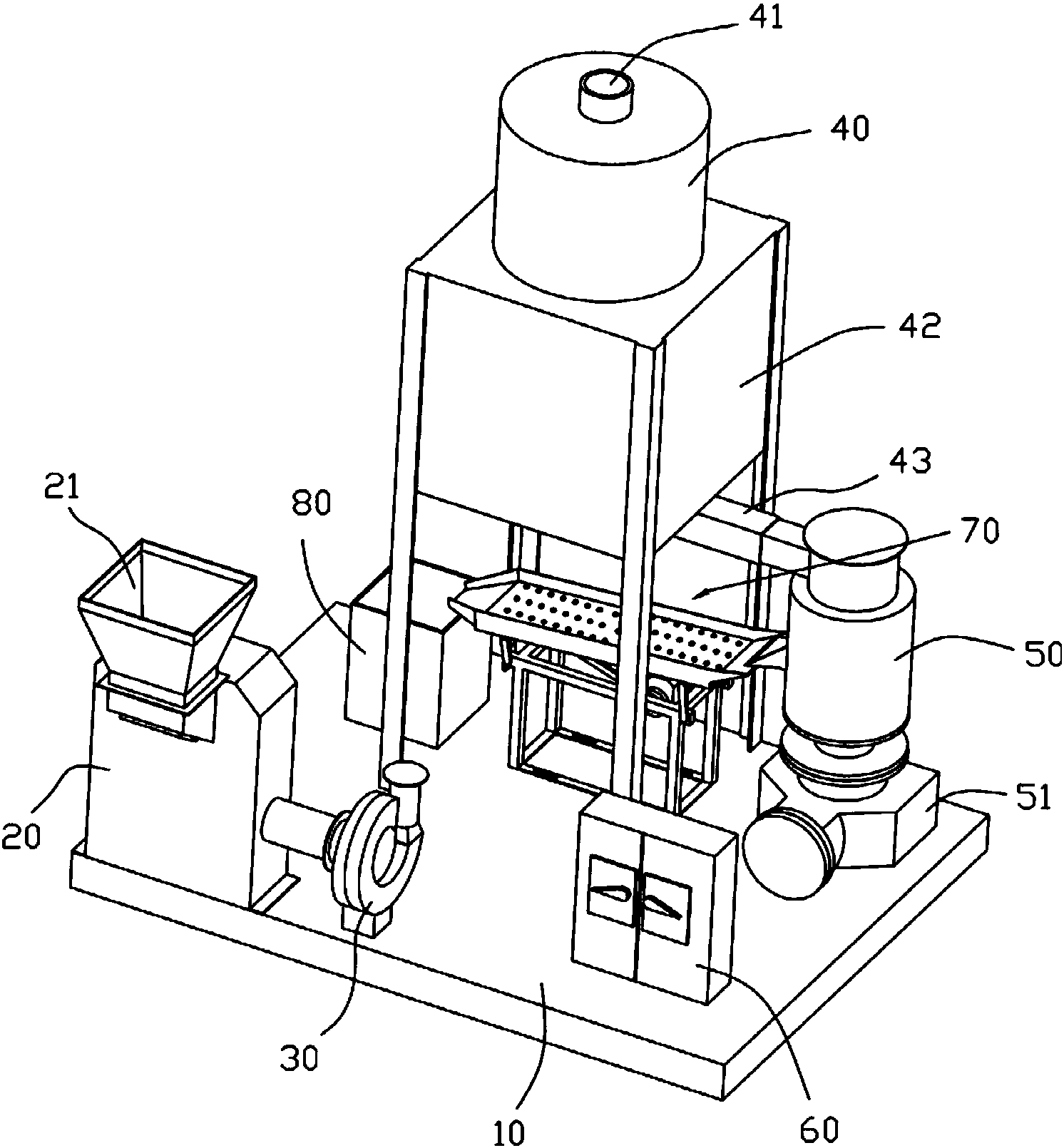 1.一種污泥干燥成型機(jī),包括底板(10)、風(fēng)干機(jī)(20)、高溫烘干機(jī)(40)、離心甩干機(jī)(50)和研磨機(jī)構(gòu)(70);其特征在于:所述風(fēng)干機(jī)(20)、高溫烘干機(jī)(40)、離心甩干機(jī)(50)和研磨機(jī)構(gòu)(70)都位于底板(10)之上,風(fēng)干機(jī)(20)上部設(shè)有風(fēng)干機(jī)入口(21),風(fēng)干機(jī)(20)的另一側(cè)設(shè)有風(fēng)干機(jī)出口(22),所述風(fēng)干機(jī)(20)與鼓風(fēng)機(jī)(30)連接;所述高溫烘干機(jī)(40)的頂部設(shè)有烘干機(jī)輸入管(41),所述烘干機(jī)輸入管(41)與風(fēng)干機(jī)出口(22)連接,高溫烘干機(jī)(40)的下方設(shè)有高溫箱體(42),高溫箱體(42)通過烘干機(jī)輸出管(43)連接至離心甩干機(jī)(50),離心甩干機(jī)(50)的側(cè)部設(shè)有研磨機(jī)構(gòu)(70),所述研磨機(jī)構(gòu)(70)位于高溫箱體(42)的下方。