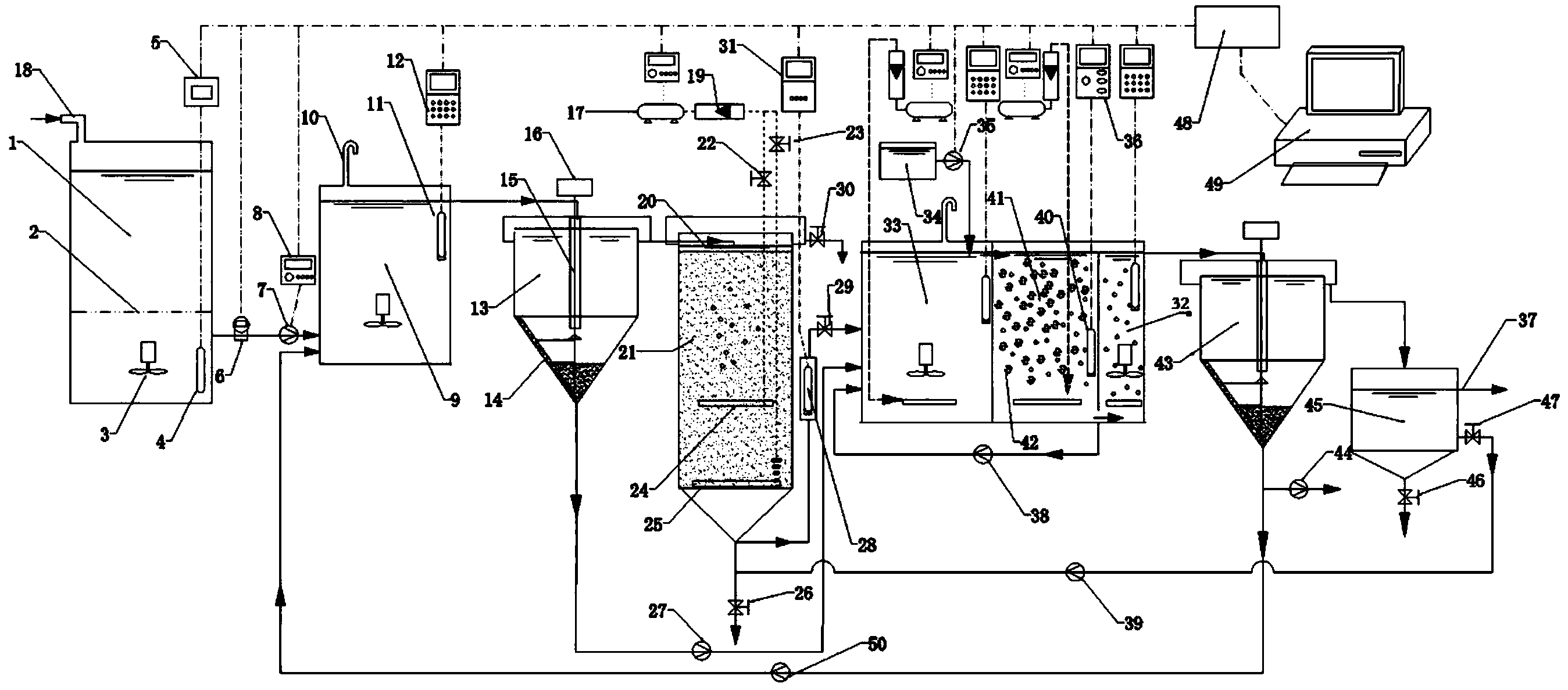 9.根據權利要求1所述的高自適應性的污水深度凈化裝置,其特征在于:所述PLC與上位機相連;PLC與在線氧化還原電位測定儀器之間、PLC與變頻器之間、PLC與在線溶解氧測定儀器之間、PLC與在線pH測定儀器之間、PLC與有機碳源計量泵之間、PLC與液位傳感器之間、PLC與液體電磁流量計之間的電連接均采用485通信方式連接。