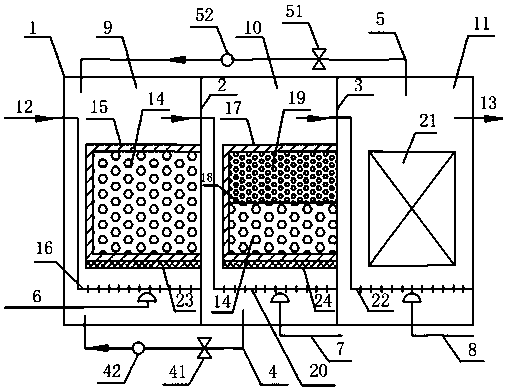 所述厭氧區(qū)內(nèi)固定設(shè)有用于填充若干流離球的第一填料固定床,所述第一填料固定床的下方設(shè)有第一布水系統(tǒng),所述第一曝氣裝置設(shè)置在所述第一布水系統(tǒng)下方;所述好氧區(qū)內(nèi)固定設(shè)有第二填料固定床,所述第二填料固定床內(nèi)設(shè)有將所述第二填料固定床內(nèi)腔分為上腔和下腔的第三隔板,所述上腔內(nèi)填充有生物流化床填料,所述下腔內(nèi)填充有若干流離球,所述第二填料固定床下方設(shè)有第二布水系統(tǒng),所述第二曝氣裝置設(shè)置在所述第二布水系統(tǒng)下方;所述MBR區(qū)內(nèi)固定設(shè)有MBR膜組件,所述MBR膜組件的下方設(shè)有第三布水系統(tǒng),所述第三曝氣裝置設(shè)置在所述第三布水系統(tǒng)下方。
