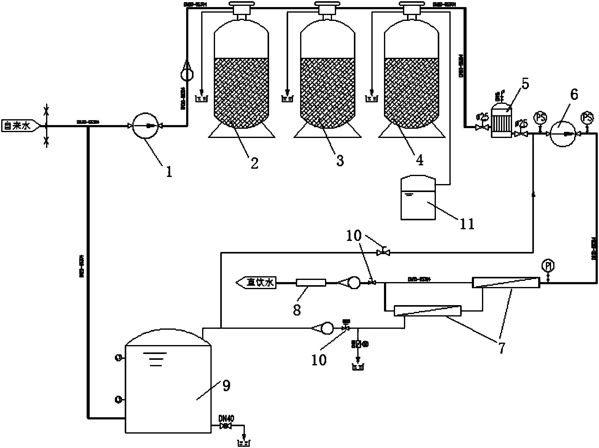 所述一段納濾設(shè)備的入口通過管道與高壓泵連接,一段納濾設(shè)備的第一出口與二段納濾設(shè)備連接,一段納濾設(shè)備的第二出口通過第五輸水管道與輸出水管道連通,二段納濾設(shè)備的第一出口連接至第五輸水管道;所述輸出水管道上設(shè)有閥門;高壓泵提供整個過程水流動的動力,一段納濾設(shè)備的濃水進入二段納濾設(shè)備作為其進水,二段納濾設(shè)備產(chǎn)生的濃水通過閥門控制一部分回流至一段納濾設(shè)備的進口,回流至一段納濾設(shè)備的濃水再次進入二段納濾設(shè)備,從而使?jié)馑?jīng)過四次納濾循環(huán);二段納濾設(shè)備產(chǎn)生的另一部分濃水作為石英砂過濾器的反洗水,系統(tǒng)回收率達到80%,相當(dāng)于原水被濃縮了4倍。該水處理機是在保證產(chǎn)品水水質(zhì)的情況下,通過閥門控制濃水回流的流量,實現(xiàn)直飲水系統(tǒng)的高回收率。