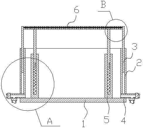 為了實現以上目的,本實用新型采用的技術方案為:一種污泥穩定盛裝裝置,它包括盛裝容器,所述的盛裝容器包括底板(1)和側板(2),所述的側板(2)的底部連通有進料管(4),所述的側板(2)為中空結構,且中空部位套接有內套板(3),所述的內套板(3)上部設置有過濾層(6)。