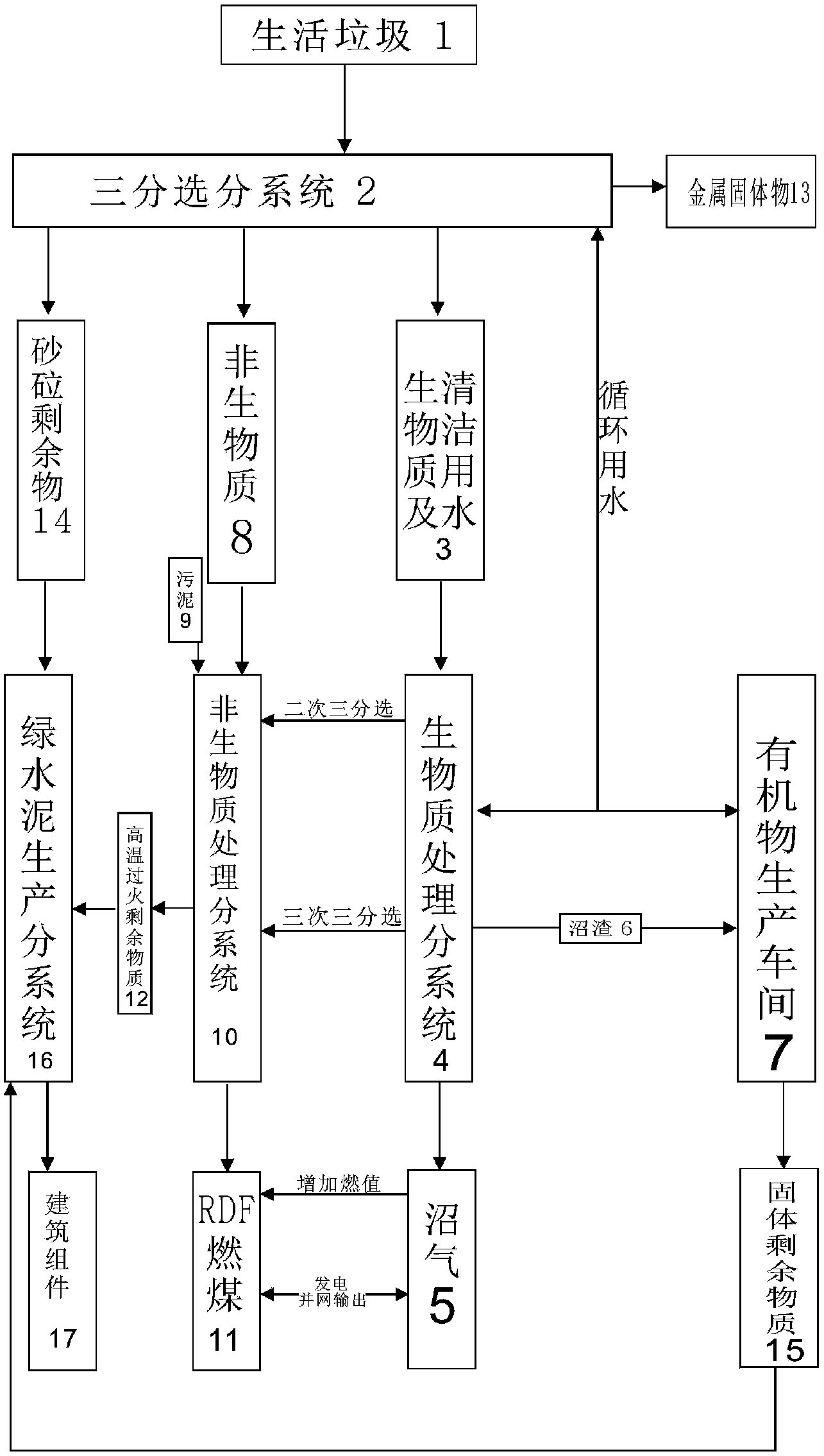 作為優選,所述的沼氣可以用于回流增加RDF燃煤的燃値也可發電并網輸送,所述RDF燃煤可發電并網輸送也可固體成品出售,所述生物質處理系統二次三分選產生的細微非生物質加入非生物質處理分系統,所述非生物質處理系統三次三分選由擠壓產生的生物質漿液加入生物質處理分系統,所述三分選分系統與所述生物質處理分系統與有機肥生產車間形成循環用水。