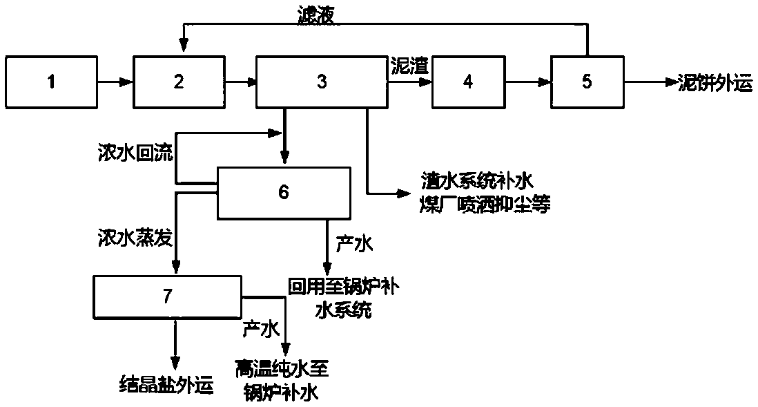 2)、步驟1)中的產(chǎn)水一部分可回用于除渣補(bǔ)水和煤廠抑塵等,其余部分通過碟管式反滲透裝置(6)后,產(chǎn)水回用于鍋爐補(bǔ)給水處理系統(tǒng),濃水進(jìn)入下一級處理工序;