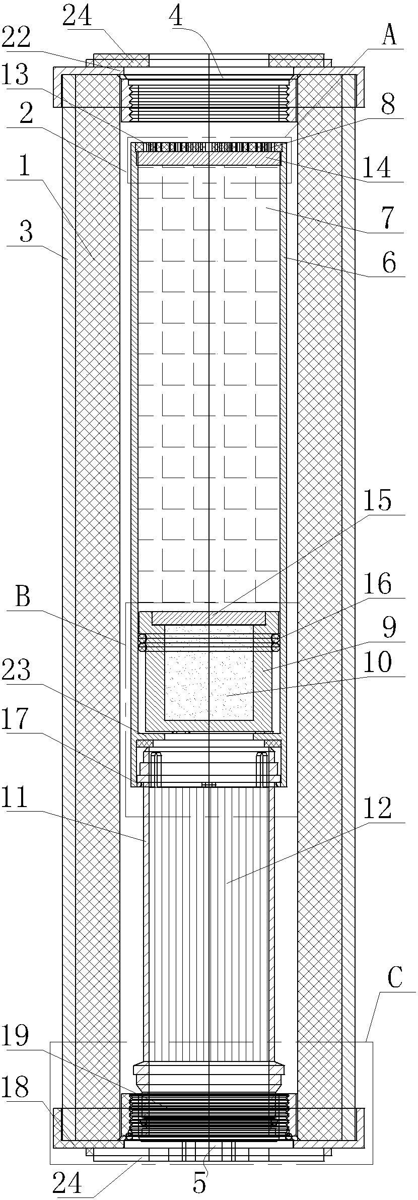 所述燒結活性炭罐位于所述軟化樹脂罐的下端的對應腔體內,所述燒結活性炭罐的上端面和所述PP棉墊片的下端面之間設置有所述陽離子軟化樹脂,所述燒結活性炭罐的上端面蓋裝有活性炭塞片;