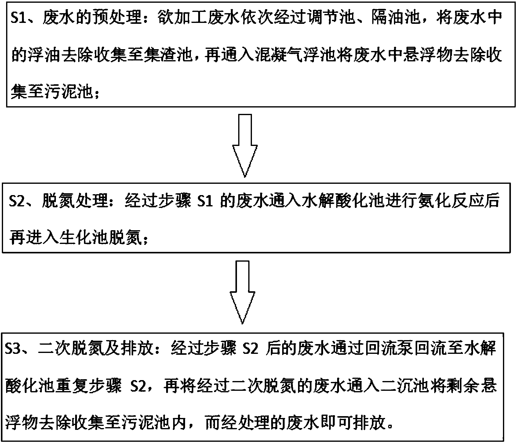 S2、脫氮處理:經(jīng)過步驟S1的廢水通入水解酸化池進(jìn)行氨化反應(yīng)后再進(jìn)入生化池脫氮;