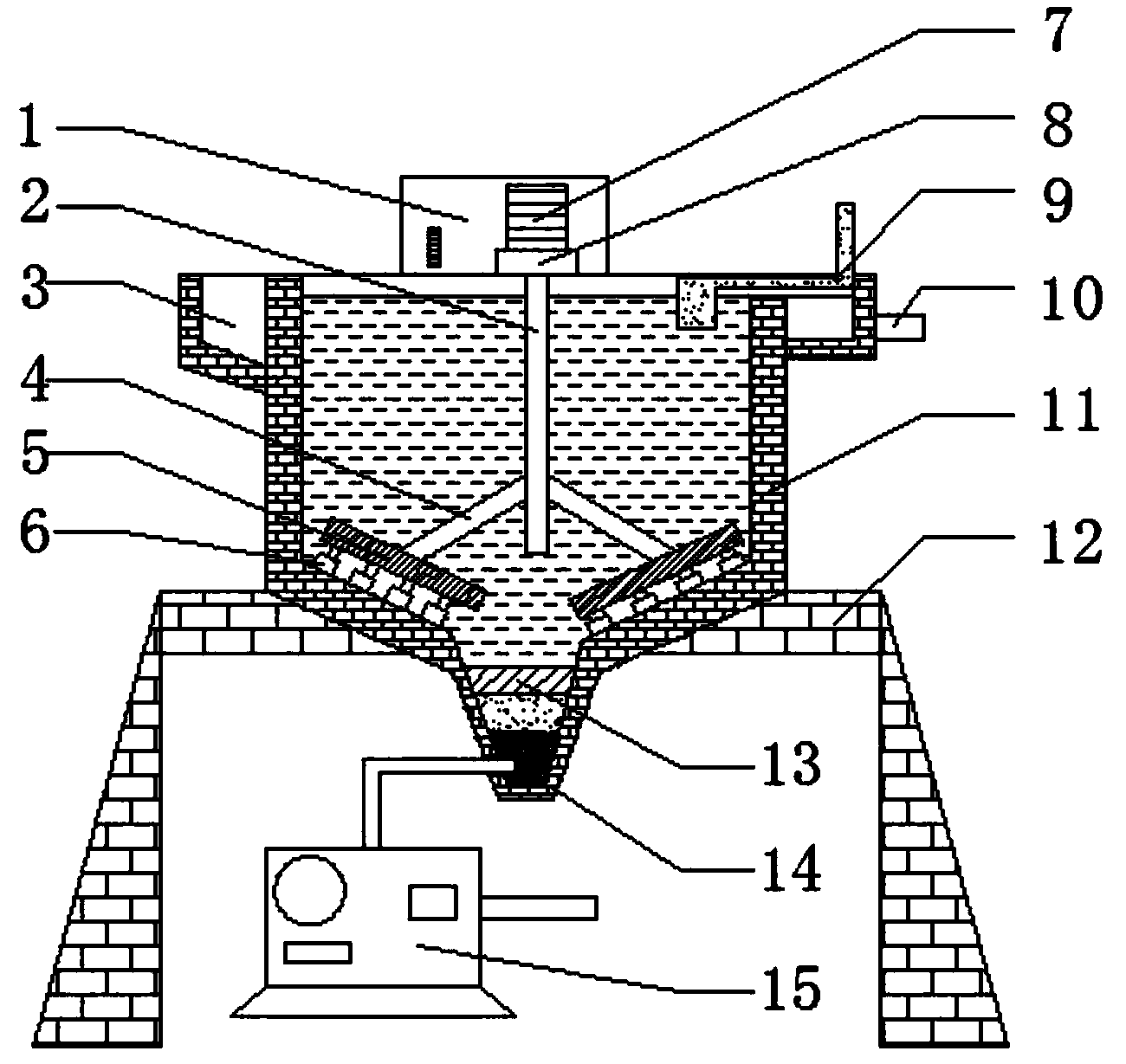 與現(xiàn)有技術(shù)相比,本實(shí)用新型的有益效果是:本實(shí)用新型一種污水處理初沉池結(jié)構(gòu)科學(xué)合理,操作安全方便,在初沉池內(nèi)設(shè)置有刮泥裝置,讓污水旋轉(zhuǎn)沉淀,還可清理干凈底部污泥,提高沉淀效率,且在污泥儲存裝置上方設(shè)置有開合板,使沉淀污泥充分沉淀,讓污泥中水分將至最低,下方設(shè)置有污泥排解裝置,使污泥盡數(shù)排出。
