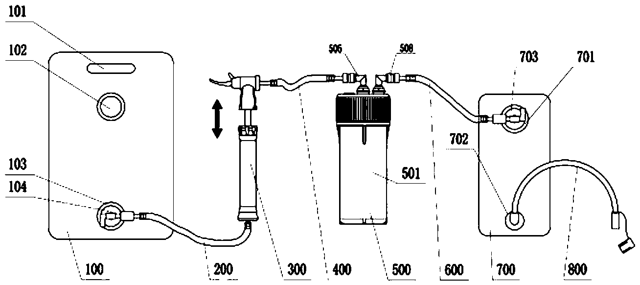 2.如權利要求1所述的一種用于應急的飲用水處理器,其特征在于,所述原水水袋(100)和產水水袋(700)均為軟體水袋;所述原水水袋(100)頂端設置手提把手(101);所述原水水袋(100)設置有原水進口(102)和原水出口(103);所述原水出口(103)通過第一旋轉接頭(104)與進水軟管(200)相連;所述單向手動泵(300)連接有進水軟管(200)和超濾進管(400);所述超濾過濾器(500)連接有超濾進管(400)和超濾出管(600);所述產水水袋(700)設置有產水進口(701)和產水出口(702);所述產水進口(701)通過第二旋轉接頭(703)與超濾出管(600)相連;所述產水出口(702)連接有排放管(800)。