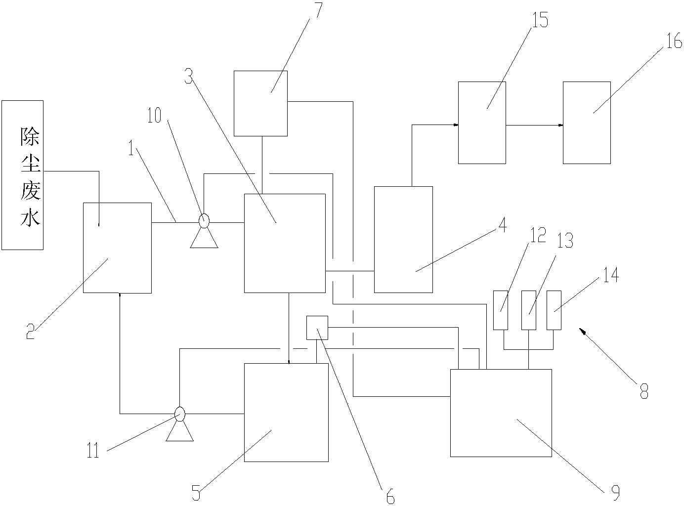 本實用新型目的是為了克服現有技術的不足而提供一種新型高效除塵廢水循環凈化監控系統,結構簡單、高效環保。