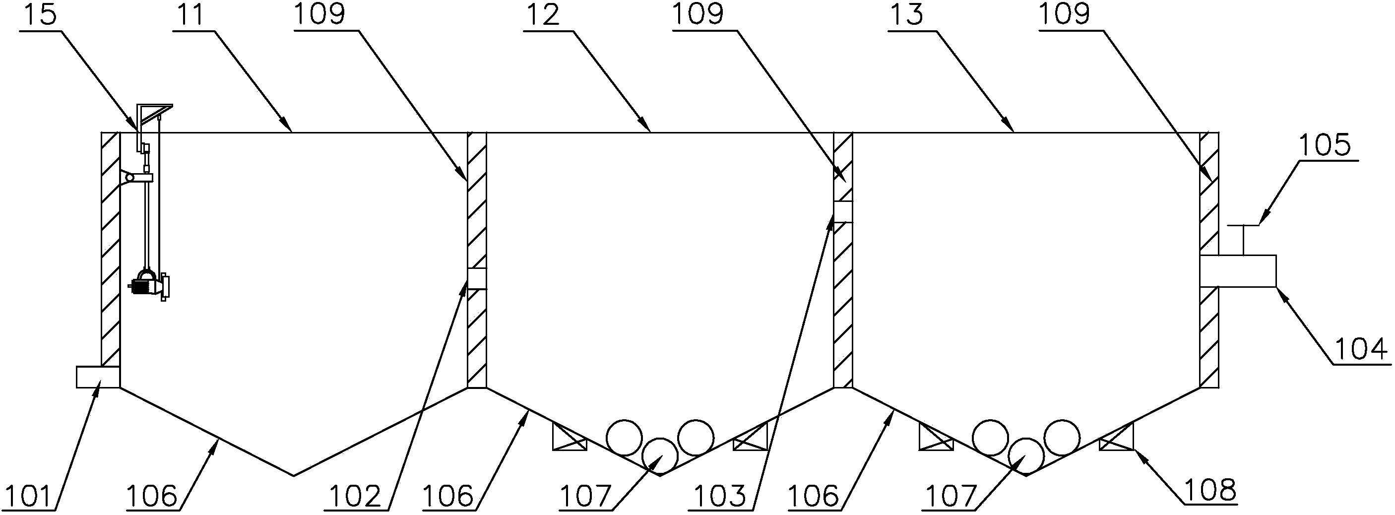 優選的,所述無氧反應區和有氧反應區的底板下部均設有振動器,振動器的振動作用將污泥想V形底板的底部聚集,避免了污泥在底板上結塊,減輕了后續污泥處理的負擔,降低了工人的勞動強度。進一步優選地,所述振動器為插入式振動器或平板振動器。