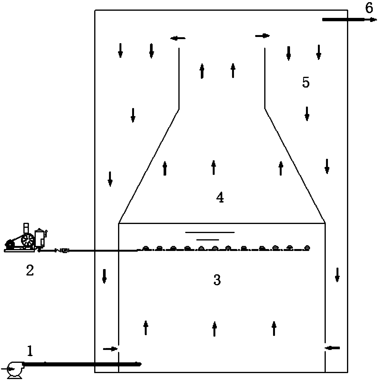 1.一種厭氧顆粒污泥氨氧化法污水脫氮處理裝置,包括厭氧顆粒污泥連續處理池,其特征在于:所述厭氧顆粒污泥連續處理池內下端中部為一級消化室(3),一級消化室(3)上端通過管道與鼓風機(2)連接;厭氧顆粒污泥連續處理池內上端中部為二級反應室(4),二級反應室(4)位于一級消化室(3)正上方,二級反應室(4)頂部開口;一級消化室(3)和二級反應室(4)外側為固液分離室(5)。