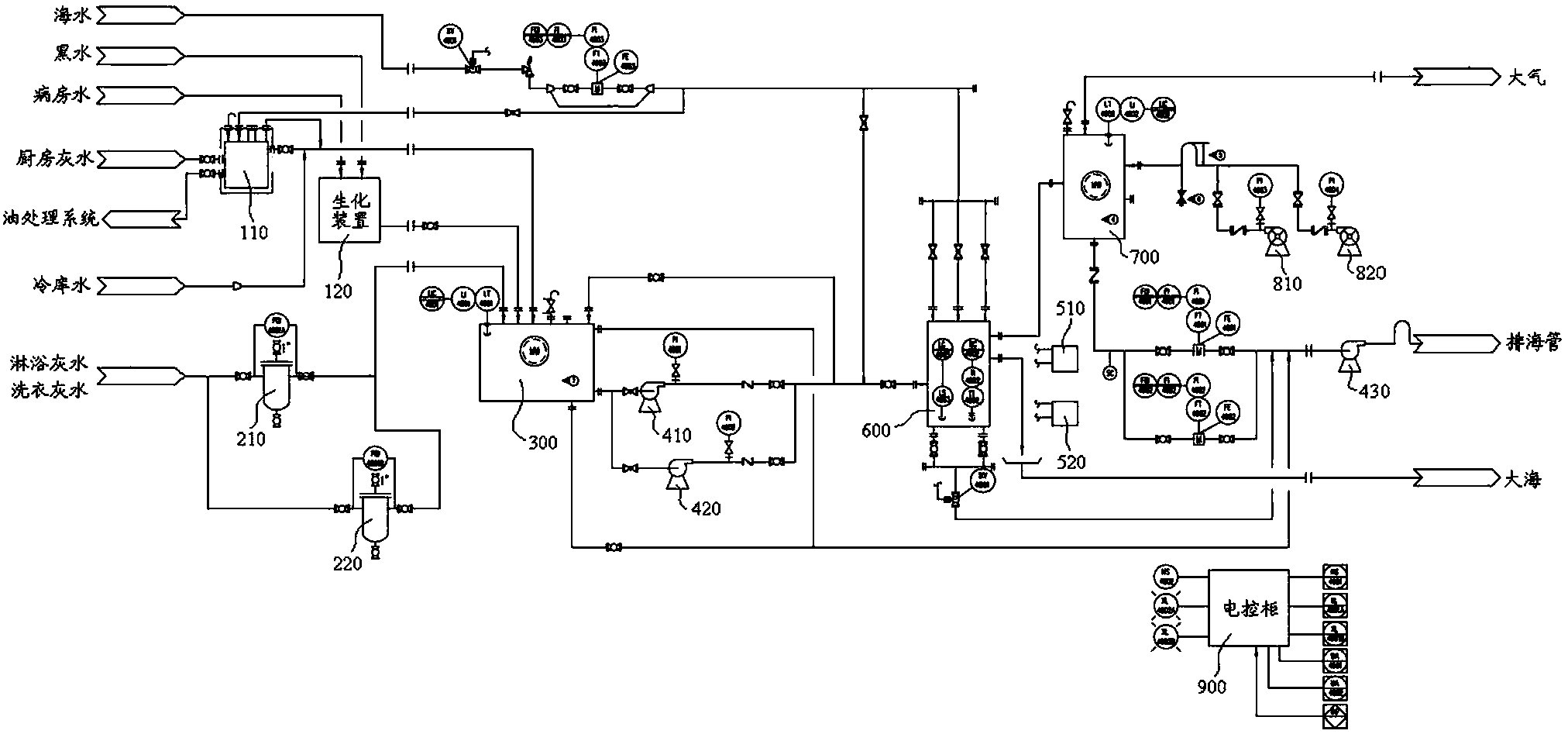9.如權利要求8所述的海洋污水處理設備,其特征在于:所述廚房管道、油處理管道、冷庫水管道、洗手間管道、病房管道、淋浴房管道、洗衣房管道及海水管道均為硬聚氯乙烯材質的排水管。