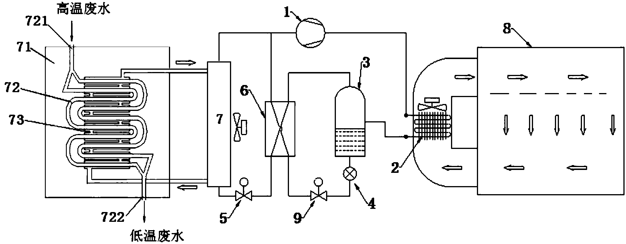 熱廢水熱交換系統(71),所述熱廢水熱交換系統(71)在所述蒸發器(7)處與所述第二冷媒循環閉合回路進行耦合熱交換;