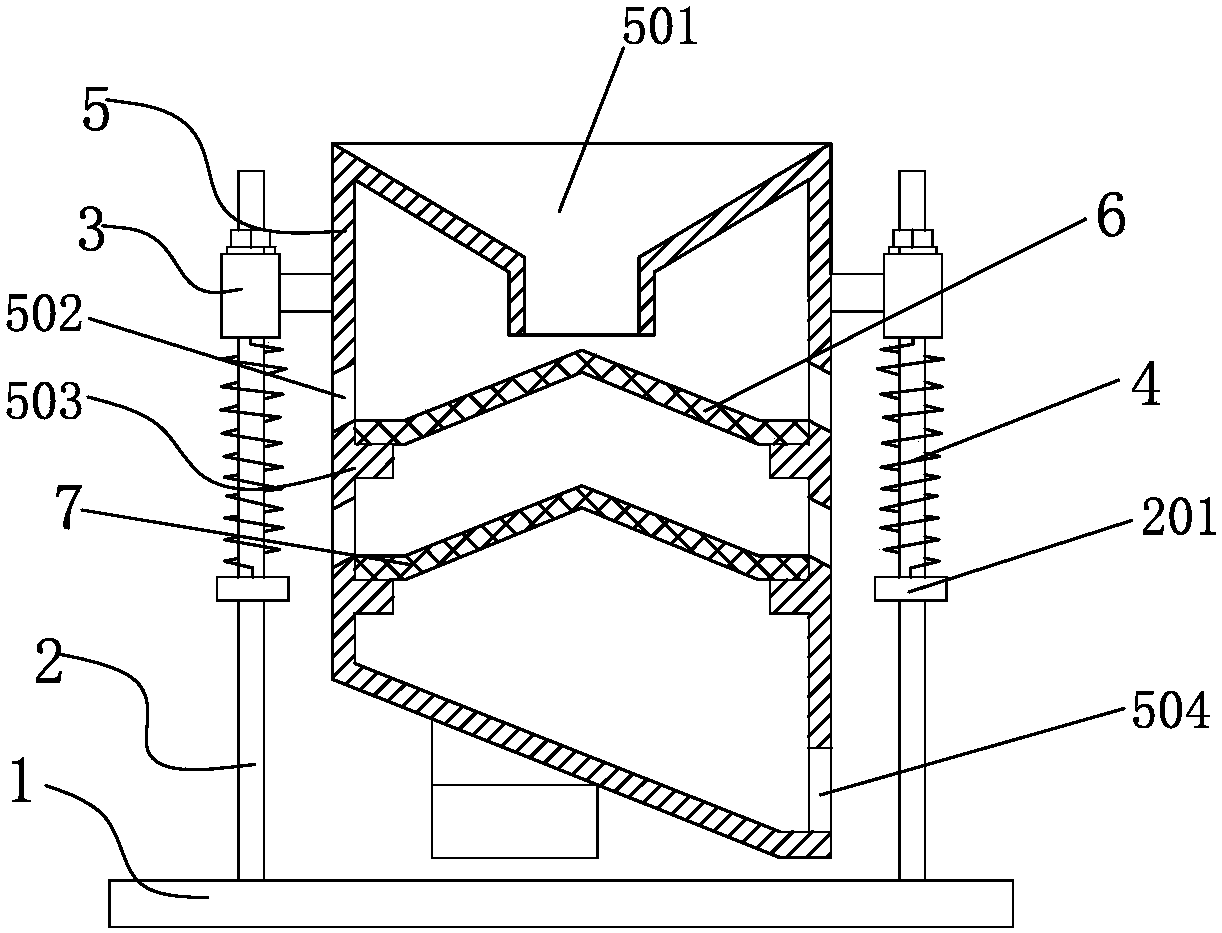 4.根據權利要求1所述的一種工業污水過濾裝置,其特征在于:所述第一過濾網(6)、第二過濾網(7)尖角朝向進料孔(501)方向。