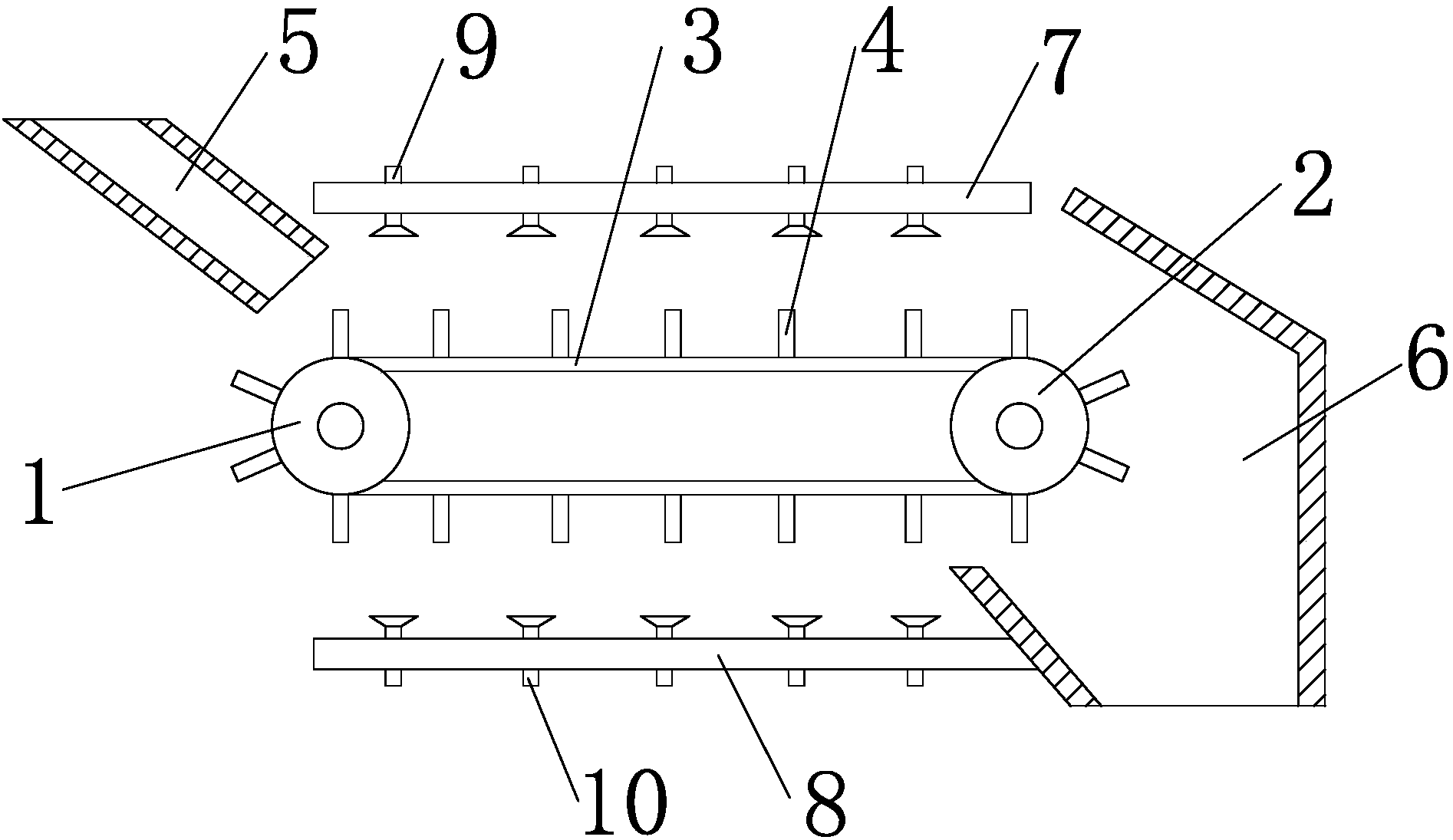 1.一種工業污泥干燥設備,包括進料管(5)、排料管(6),其特征在于:還包括第一驅動輥(1)、第二驅動輥(2),所述第一驅動輥(1)、第二驅動輥(2)外側纏繞有輸送帶(3),所述輸送帶(3)呈網狀結構,所述輸送帶(3)表面上設置有若干個排料葉片(4),所述輸送帶(3)上側設置有上固定板(7),下側設置有下固定板(8),所述上固定板(7)上設置有若干個上烘干噴頭(9),所述下固定板(8)上設置有若干個下烘干噴頭(10)。
