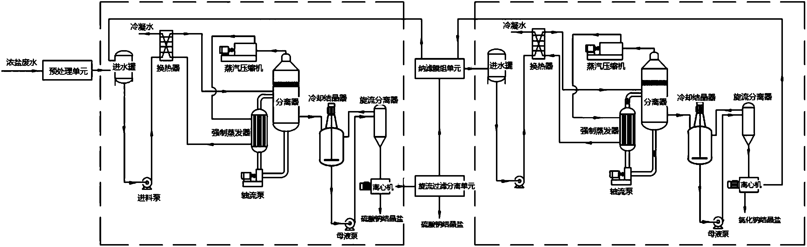 由于采用了第一MVR強制蒸發單元、旋流分離過濾單元、納濾膜組單元及第二MVR強制蒸發單元組成的裝置,整套裝置占地面積小,運行成本低;通過第一MVR強制蒸發單元及第二MVR強制蒸發單元中的蒸汽壓縮機將蒸發中產生的二次蒸汽壓縮升溫后再次使用的原理,不但避免使用新鮮蒸汽,而且徹底摒棄了冷卻塔,大大降低了運行費用,實現環保節能、節水、節約費用;通過納濾膜組單元進行二價硫酸根離子的分離去除,大幅度提高了結晶分鹽的純度。同時,整套裝置能實現結晶母液的回流,分離后的母液回到前置單元進行循環分離,不向外界排放,保證了物料的循環分離,實現廢水零排放。這樣,有效解決了現有技術中的傳統蒸發結晶方法能耗較高,運行成本高,設備占地面積大,無法避免蒸發器內部結晶和結垢的技術問題,實現了低能耗、低成本、無二次污染的處理高鹽廢水并實現資源的回收利用,大幅度提高結晶分鹽的純度,保證廢水零排放的技術效果。