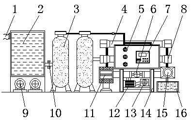 與現有技術相比,本發明的有益效果是:該花卉種植專用水處理設備,多層精密的過濾,水質干凈,對純水進行溶氧,增加純水中的含氧量,有利于植物的生長,大功率驅動電機,水質凈化速度快,緊急制動把手可應對各種緊急故障,使用安全,全自動化系統,操作簡便。