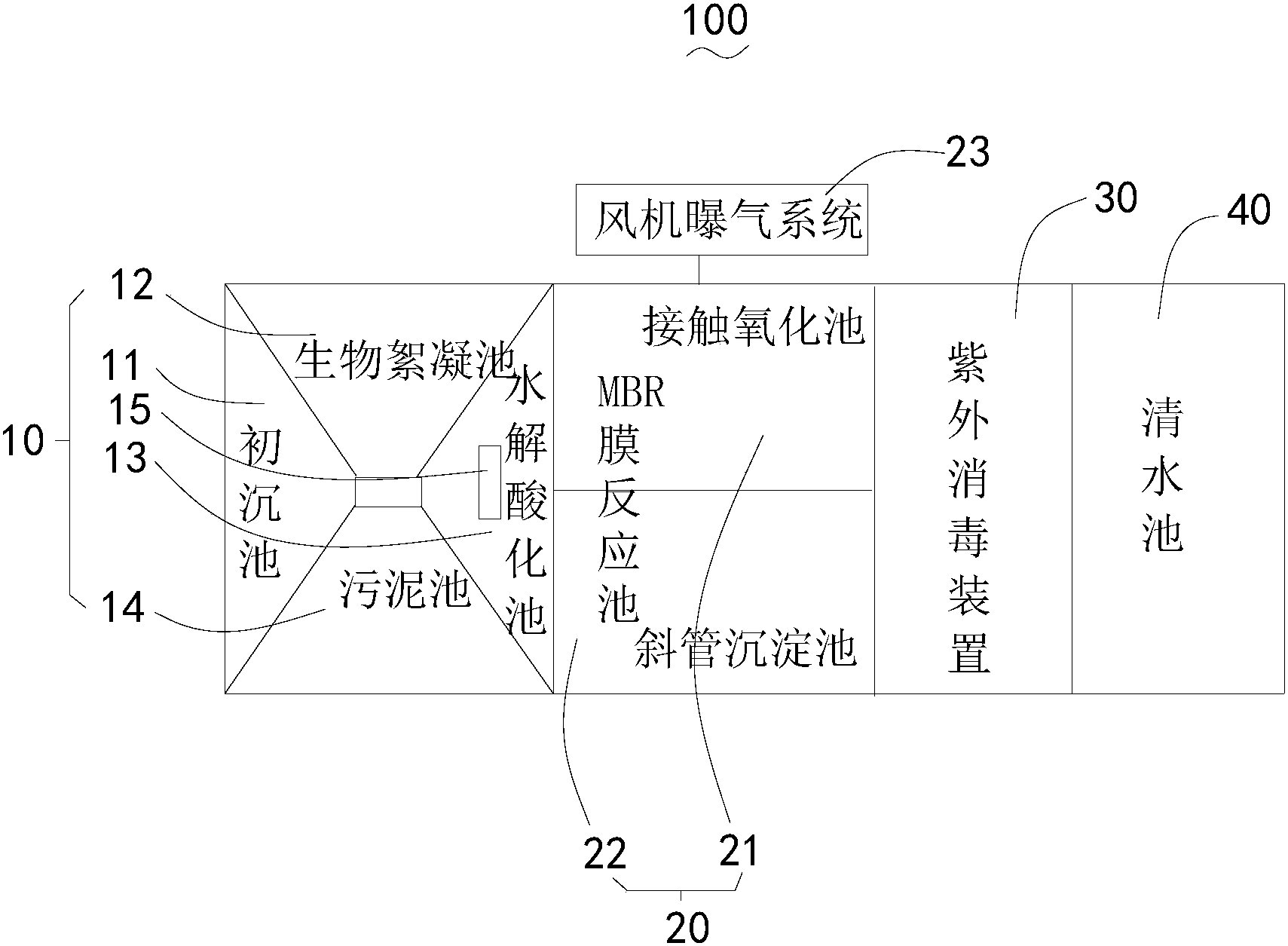 生物絮凝酸化池、MBR膜反應池、紫外消毒裝置以及清水池;所述生物絮凝酸化池由初沉池、生物絮凝池、水解酸化池以及污泥池組合形成,所述MBR膜反應池由接觸氧化池、斜管沉淀池組合形成;所述初沉池的出水口與所述生物絮凝池的入水口連通,所述生物絮凝池的出水口與所述水解酸化池的入水口連通,所述水解酸化池的出水口與所述接觸氧化池的進水口連通,所述污泥池位于所述生物絮凝池與水解酸化池的下方并通過一污泥斗與所述生物絮凝池、水解酸化池的污泥出口連通,所述生物絮凝池與所述斜管沉淀池的污泥出口連通;所述接觸氧化池的出水口與所述斜管沉淀池的入水口連通;所述斜管沉淀池的出水口與所述紫外消毒裝置的入水口連通,所述紫外消毒裝置的出水口與所述清水池連通;