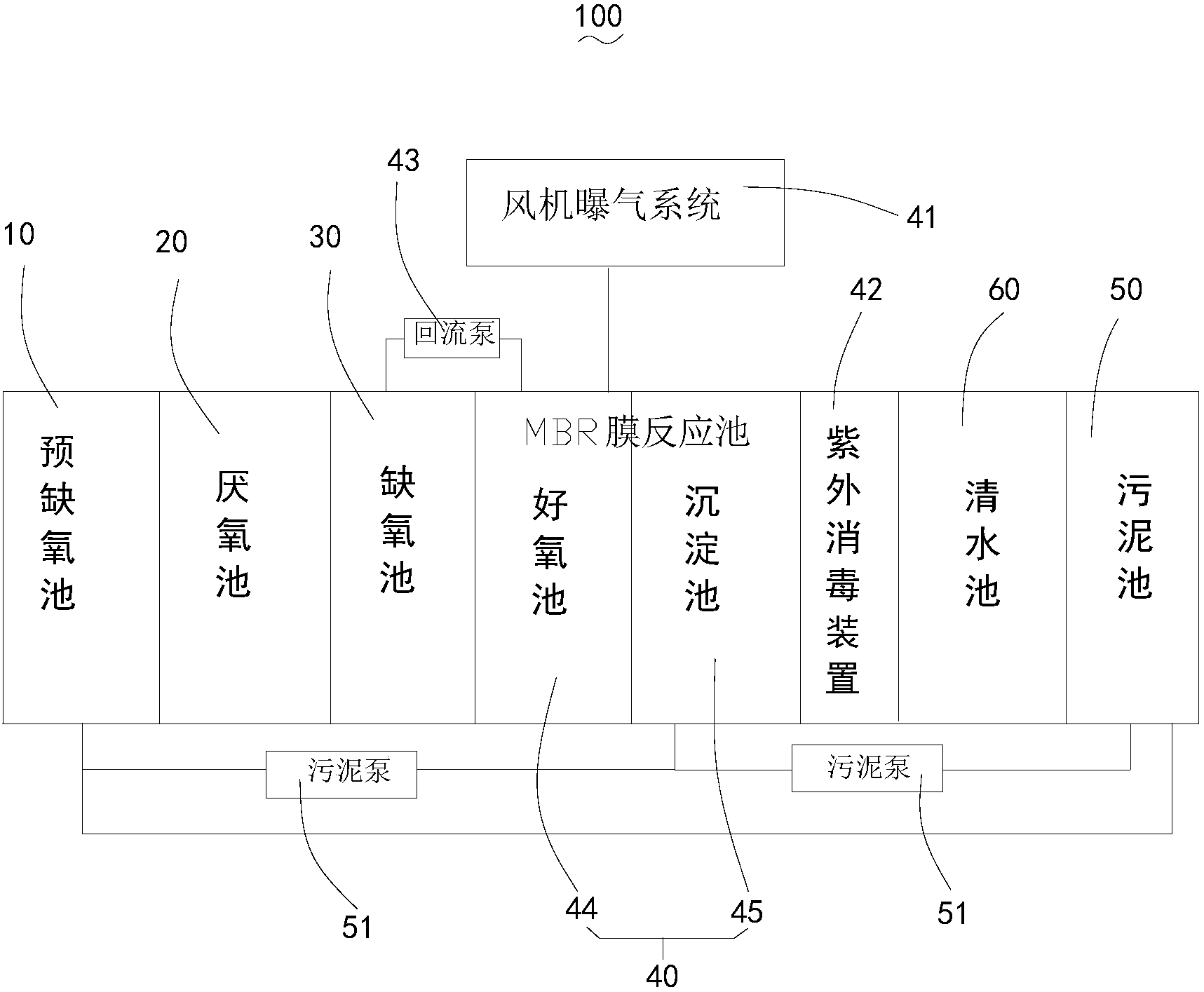 預缺氧池,具有生活污水入口;厭氧池,所述厭氧池的進水口與所述預缺氧池的出水口連通;缺氧池,所述缺氧池的進水口與所述厭氧池的出水口連通;MBR膜反應池,所述MBR膜反應池的進水口與所述缺氧池的出水口連通,所述MBR膜反應池與一風機曝氣系統連接,所述MBR膜反應池還通過回流泵與所述缺氧池連通,所述MBR膜反應池的污泥口分別與預缺氧池以及一污泥池通過污泥泵連通,所述MBR膜反應池的出水口與一紫外消毒裝置的入水口連通,所述污泥池的上部與所述預缺氧池連通;清水池,與所述紫外消毒裝置的出水口連通;