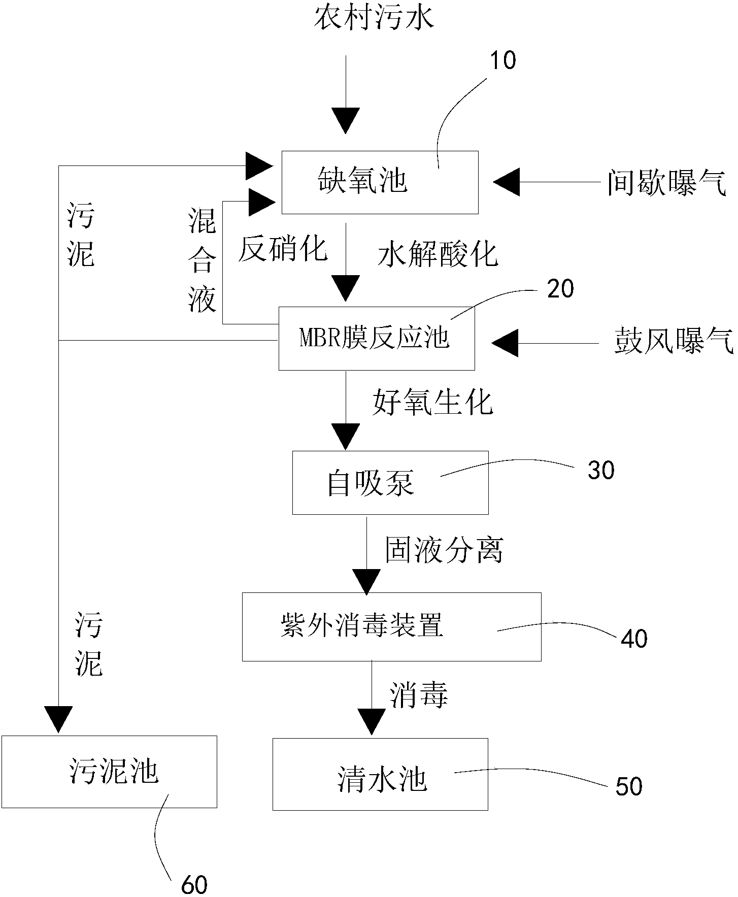 農村污水一體化處理裝置,其包括:缺氧池、MBR膜反應池、自吸泵、紫外消毒裝置、清水池以及污泥池,所述缺氧池的出水口與所述MBR膜反應池的進水口連通,所述MBR膜反應池靠下部位置通過一回流管與所述缺氧池靠下部位置連通,所述MBR膜反應池的出水口與所述自吸泵連通,所述自吸泵的出水口與所述紫外消毒裝置連通,所述紫外消毒裝置與所述清水池連通,所述MBR膜反應池的污泥口分別通過一污泥泵與所述污泥池、缺氧池連通;所述缺氧池與一間歇曝氣系統連接,所述MBR膜反應池與一鼓風曝氣系統連接。