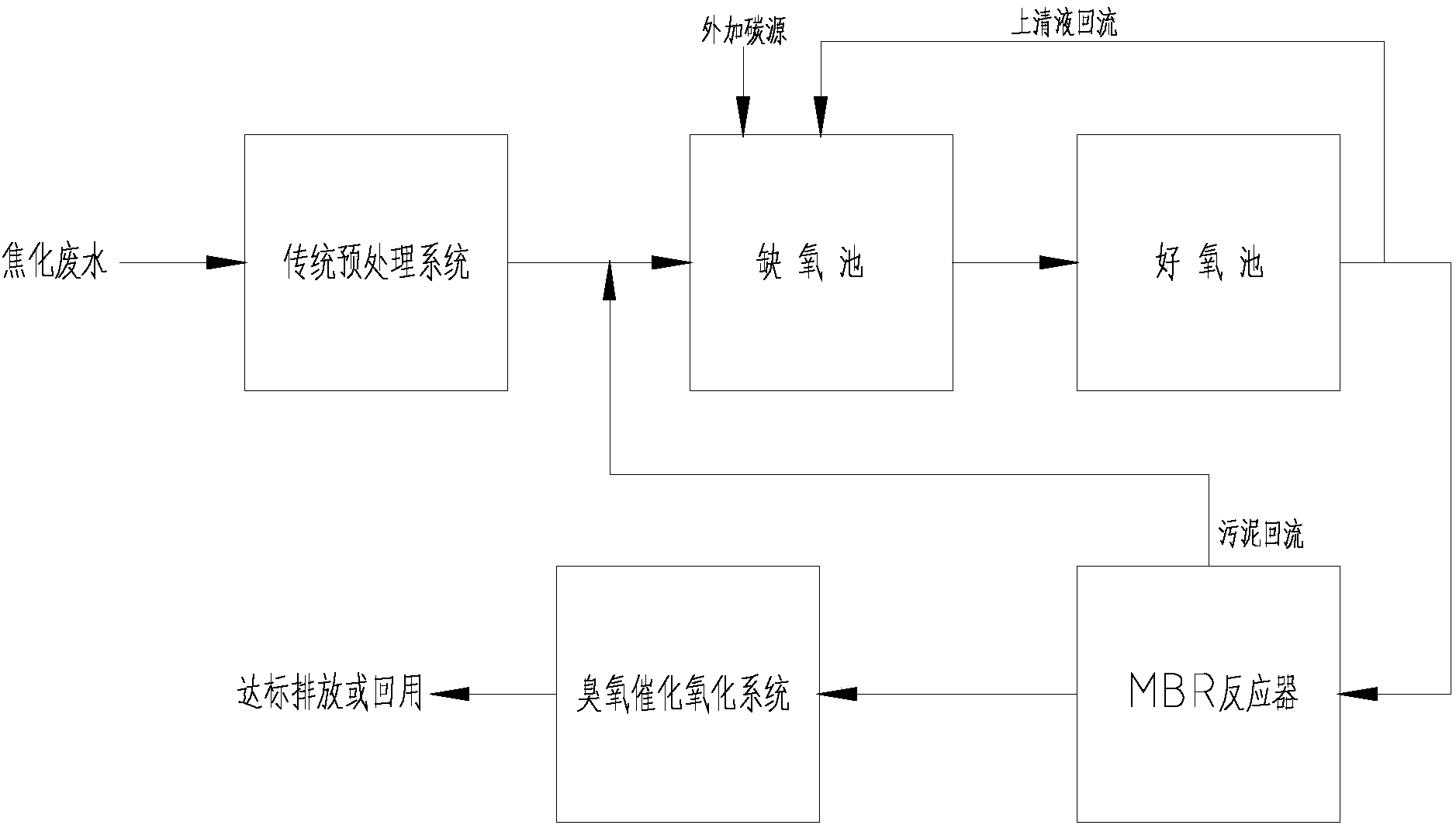 為克服以上不足,本發明提供一種焦化廢水處理裝置及其處理方法,由多種工藝聯用的技術全面深度降解焦化廢水中的污染物,使出水達標排放。實驗表明:傳統物化預處理后的焦化廢水再經過A/O+MBR生化處理+臭氧深度處理工藝處理后,出水COD小于50mg/L,TN小于20mg/L,氨氮小于10mg/L,SS小于10mg/L,最終出水指標明顯優于《煉焦化學工業污染物排放標準》(GB16171-2012)表2的標準。