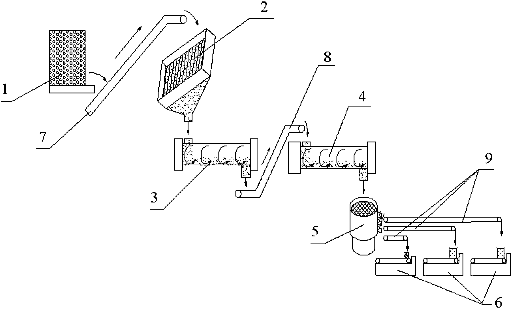 通過污泥運輸車將污泥集中到污泥池,之后通過第一傳送帶把污泥運送到脫水機進行脫水,脫水后的污泥進入到造粒機進行處理成污泥顆粒,之后通過第二傳送帶把污泥顆粒運送到干燥機進行干燥處理,經干燥處理后的干燥污泥顆粒進入到篩分機進行篩分,不同粒徑的干燥污泥顆粒經不同的出口輸出,并通過第三傳送帶運輸到袋裝機進行裝袋,形成袋裝污泥,進行二次利用。