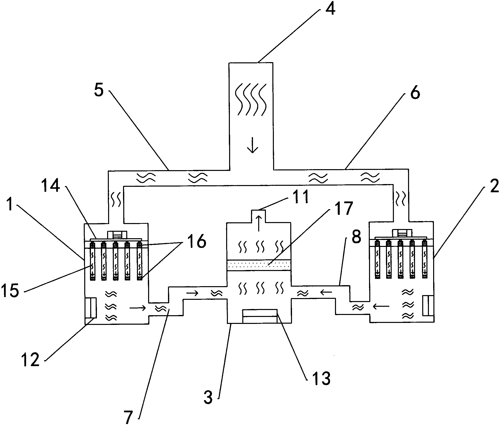 與現有技術相比,本實用新型的優點在于第一除塵塔和第二除塵塔內設置了除塵裝置,從磚窯排出的尾氣通過左管道、右管道分別進入到第一除塵塔、第二除塵塔內除塵后,再利用第一風機將過濾后的尾氣分別吹入第一管道、第二管道,從第一管道、第二管道內出來的尾氣進入到降溫塔降溫,最后通過第二風機將尾氣排放到大氣中,排放到大氣中的尾氣符合環保標準。