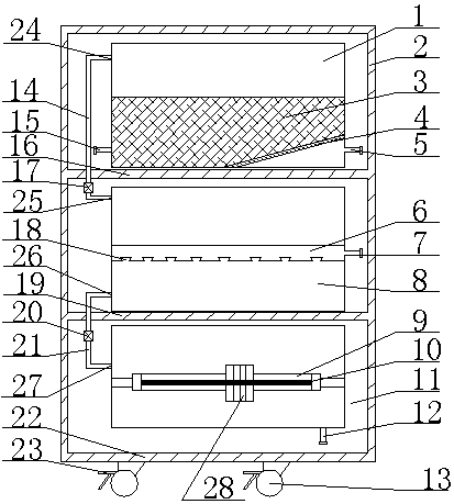 本方案是通過(guò)如下技術(shù)措施來(lái)實(shí)現(xiàn)的:一種廢水凈化消毒裝置,包括殼體,所述殼體內(nèi)設(shè)置有第一隔板和第二隔板,所述第一隔板位于所述第二隔板的上部,所述第一隔板上設(shè)置有過(guò)濾箱,所述第二隔板上設(shè)置有除臭箱,所述殼體的底板上設(shè)置有消毒箱;