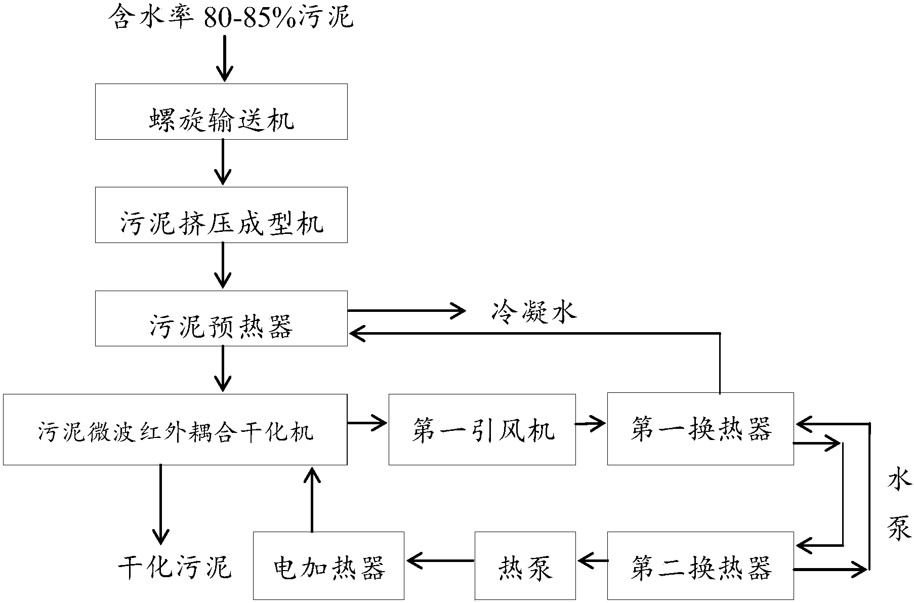 一種污泥微波紅外耦合低溫干化設備,包括螺旋輸送機、污泥擠壓成型機、污泥預熱器和微波紅外耦合干化裝置;所述螺旋輸送機、污泥擠壓成型機、污泥預熱器和微波紅外耦合干化裝置依次通過管線相連;所述微波紅外耦合干化裝置包括微波紅外耦合干化機、第一引風機、第一換熱器、第二換熱器、熱泵、水循環泵和電加熱器,其中微波紅外耦合干化機、第一引風機、第一換熱器、第二換熱器、熱泵和電加熱器依次通過通風管道連接,電加熱器還通過通風管道連接至微波紅外耦合干化機。