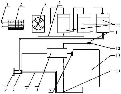 1.一種改進(jìn)的雨水處理回用裝置,包括格柵除污裝置,該格柵除污裝置一端設(shè)有進(jìn)水口,另一端連接有攪拌裝置,所述攪拌裝置與平板膜微濾裝置連接,該平板膜微濾裝置末端設(shè)有出水口,所述平板膜微濾裝置與所述攪拌裝置之間設(shè)有回流管道,其特征在于,所述平板膜微濾裝置通過儲(chǔ)水箱進(jìn)水管連接有儲(chǔ)水箱,該儲(chǔ)水箱通過回用水管連接出水口;所述儲(chǔ)水箱進(jìn)水管上設(shè)有第一閥門;所述回用水管上設(shè)有第二閥門。