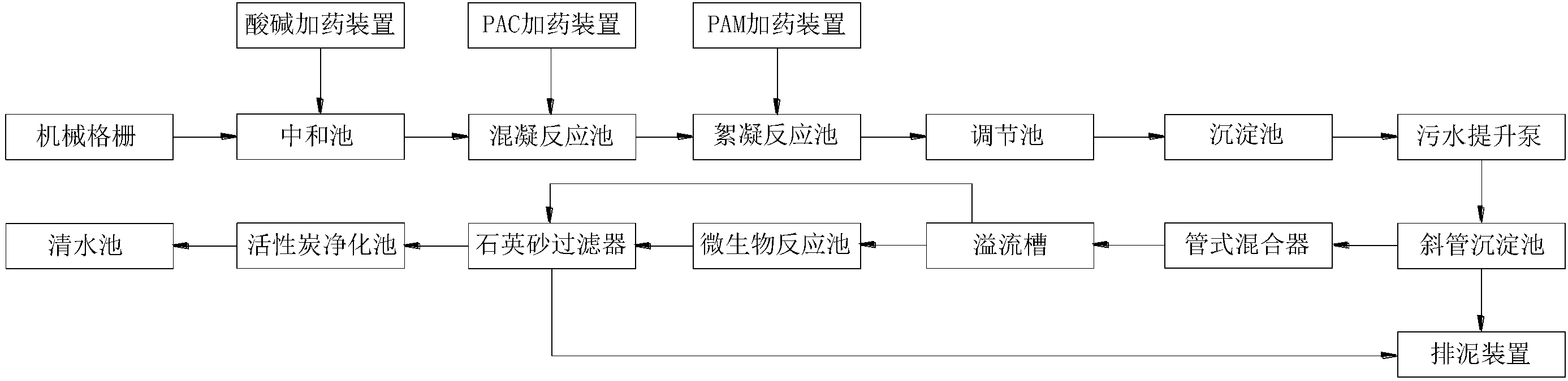 進一步的,所述斜管沉淀池和石英砂過濾器同時與排泥裝置相連。