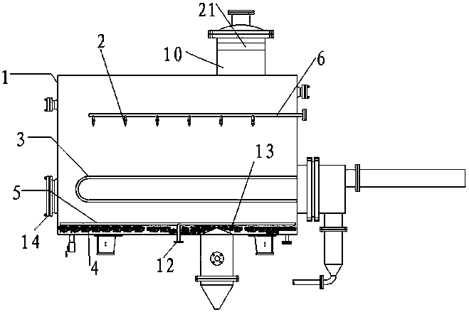 為實(shí)現(xiàn)上述目的,本發(fā)明的技術(shù)方案是提供了一種除垢分離組件,包括分離器密閉罐體和設(shè)置在分離器密閉罐體內(nèi)的料液噴嘴和與料液噴嘴配合使用的加熱管,所述料液噴嘴設(shè)置在上部,所述加熱管設(shè)置在下部且用于承接料液噴嘴噴出的料液;所述分離器密閉罐體底部設(shè)置有惰性固體顆粒和用于產(chǎn)生氣流將惰性固體顆粒吹動至流化態(tài)沸騰的壓縮空氣管。
