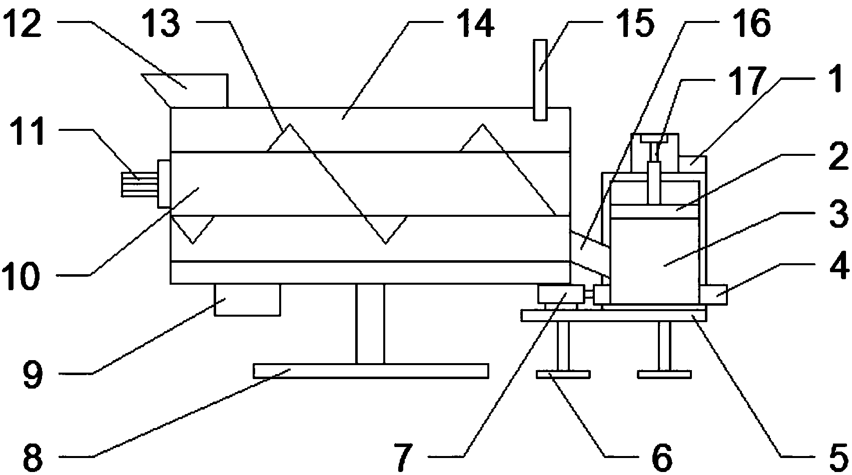 1.一種污泥脫水干化成型裝置,包括成型機、電機和干燥機;其特征在于,所述干燥機呈圓筒狀,內部設有加熱裝置和旋轉主軸,底部設有干燥機底座和加熱裝置;所述旋轉主軸由電機帶動,上面設有螺旋設置的送料葉片;在旋轉主軸的上方設有進料口和排氣管;所述進料口位于干燥機左側;所述排氣管位于干燥機的右側;所述干燥機內壁上安裝有保溫層;在遠離進料口的干燥機底部設有一個與成型機連接的送料板;所述成型機上設有液壓裝置、壓板、出料口和控制器;所述控制器位于液壓裝置右側;所述出料口位于成型機底部;所述成型機的底部設有一個液壓推桿;所述液壓推桿和成型機都固定在支撐臺上;所述支撐臺底部設有支撐底座。