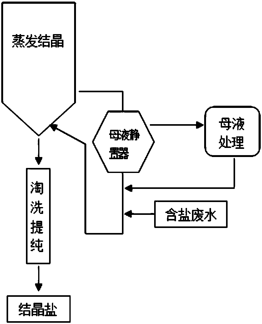 2)本發(fā)明的處理工藝得到的鹽能夠達到工業(yè)鹽國家標準,實現(xiàn)資源化,同時母液排放配合有機物去除工藝,維持系統(tǒng)有機物不累積,保證結晶鹽品質,實現(xiàn)零排放,也可針對不同類型含鹽廢水可以進行分質結晶。