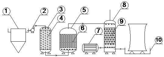 本發明解決的技術問題是提供了一種城市污水深度處理及回用于循環冷卻水系統的方法,采用纖維球過濾、陽離子交換及臭氧消毒法處理城市污水處理廠二級生化出水,然后回用于循環冷卻水系統,減輕循環冷卻水系統的結垢和腐蝕問題。本發明中污水首先通過纖維球過濾塔去除污水中大部分顆粒物、懸浮物和膠體粒子,然后進入陽離子交換塔通過離子交換去除污水中的Ca2+、Mg2+等陽離子,最終流入臭氧消毒塔內發生高級氧化反應進行消毒殺滅微生物和氧化有機物,出水則回用于循環冷卻水系統。本發明緩解了水資源短缺的問題,解決了循環冷卻水系統中設備腐蝕、結垢和微生物滋長等技術問題。同時,本發明可以有效地節約工業用水,并保證循環用水的質量,從而提高企業生產、生活用水的水平。