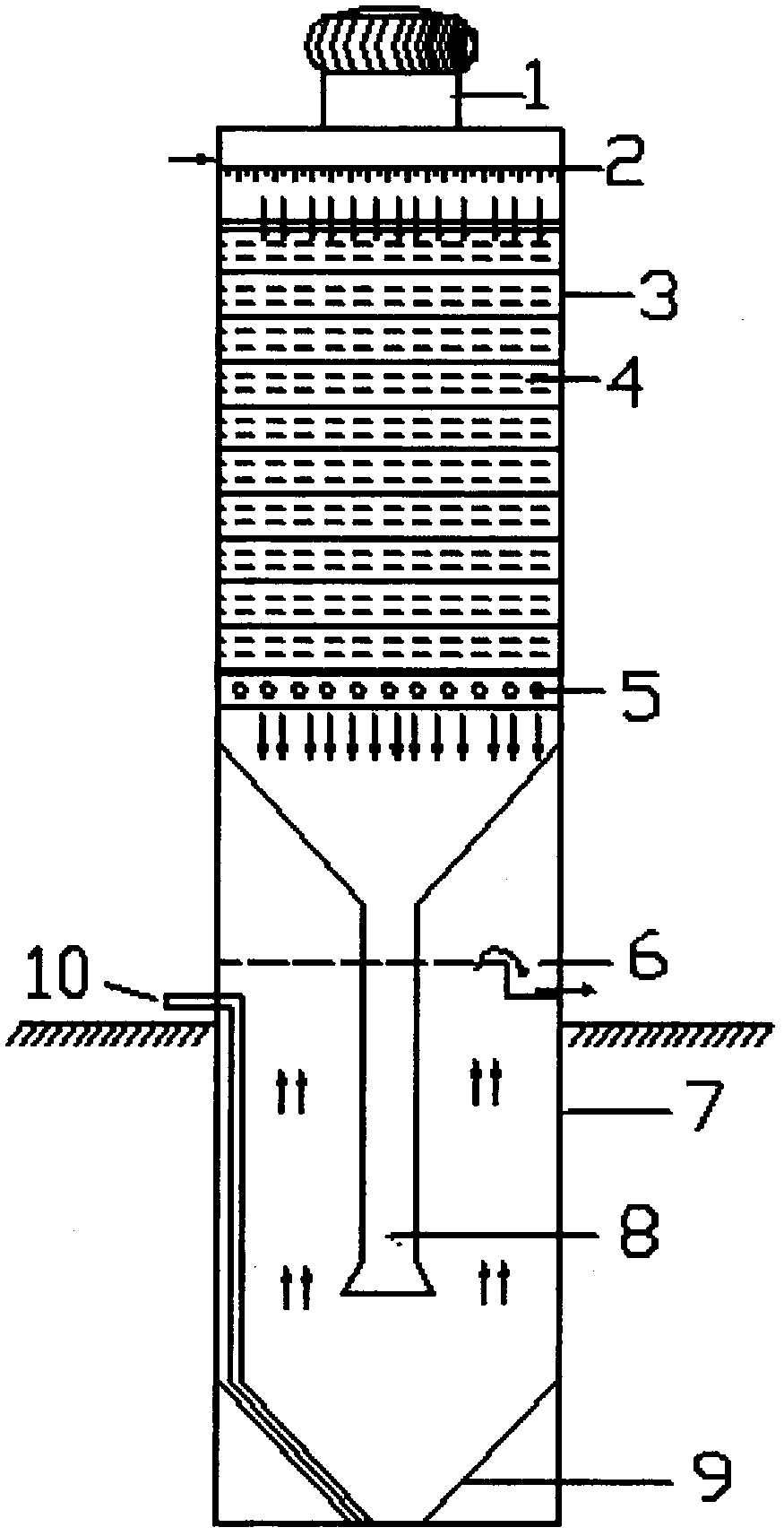 1.一種一體化微動力式污水處理裝置,該裝置通過上下2個方形箱體和一道中間通風承接板,被分隔成氧化單元和沉淀單元2個部分;上箱體為氧化單元,頂部安裝有無動力風機,內部安裝有布水系統和填充多孔濾料;下箱體為沉淀單元,安裝有沉淀中心管、集水槽和排泥管,裝置為半地埋式裝置;氧化單元通過中間通風承托層連通沉淀單元中心管,沉淀單元出水通過集水槽收集出水。